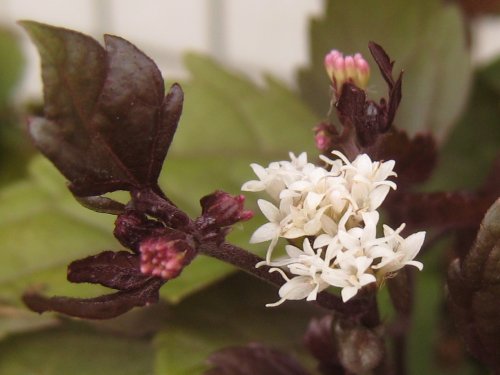 この花の苗を買ったのは去年の11月下旬。ついていた札には 「冬は地上部はなくなります」 と書いてあった。でも、今のところ枯れもせず、小さな花を咲かせ続けている。今まで 銅葉の植物を何となく避けてきた。でも、こうして植えてみると 結構おもしろい。今年は 何種類か植えてみようかな♪< ユーパトリウム・チョコラータ >