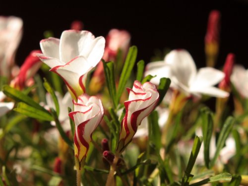 めずらしく 朝からよく晴れている。今日こそはオキザリス・バーシーカラーを咲かせてみよう、と思い花びらが巻いたままの鉢を 室内の日当たりの良い場所に置いてみた。見ていると、30分後には かなりの数の花が開き、1時間後には ほぼ満開になった。この花は、明るさと温度の両方が揃ったときに咲くんだなぁ、と納得。花の咲きみだれる春が 待ちどおしい。< オキザリス・バーシーカラー >