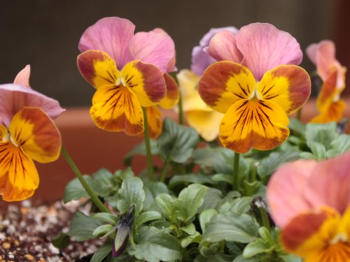 お隣との境の塀ぎわに 何を植えようか、ずいぶん迷った。今まで毎年パンジーを植えていたけど、日当たりが悪く、徒長してしまう。迷ったあげくお店の人に相談したら、「パンジーよりビオラの方がいいですよ、花の数が多いからその分にぎやかです」とのこと。さっそく、売り場のビオラの中から これまで植えた事がない色を選んで買ってきた。見ればみるほど、不思議な色あい。黒いビオラにもおどろいたけど、この色もかなりのもの。品種改良はどこまで進むんだろう。< ビオラ >