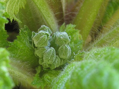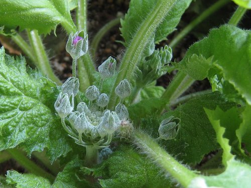 去年や一昨年の今頃は、どんな花が咲いていたんだろう。ふと そんな事を思って、古いページを見てみた。どちらにもプリムラ・マラコイデスのつぼみの事が書いてある。今年は まだだったような気がする、と思いながらベランダに出て、葉をかき分けてみたら… あった!粉砂糖をまぶしたような小さなつぼみが、いくつか かたまって ついている。今月中には咲きはじめるかな。最初に咲くのは何色だろう。毎日の楽しみが また増えた♪< プリムラ・マラコイデスのつぼみ >
