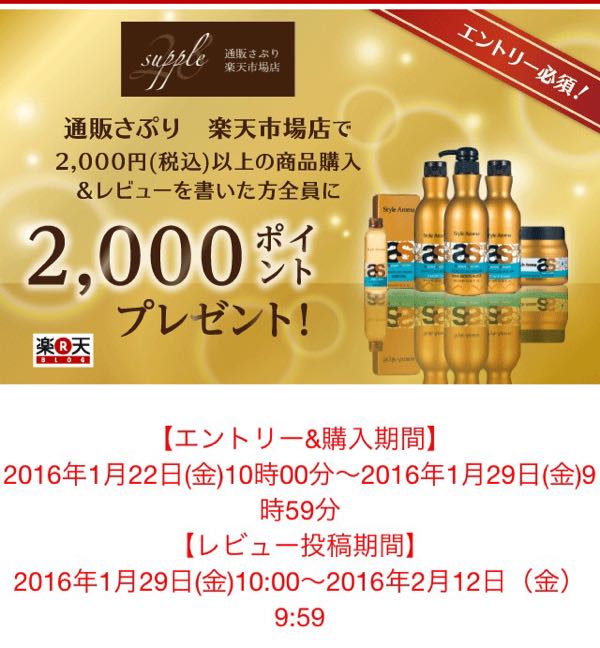 なんと今日3個目の記事。 どんだけ暇だ(笑) ☆ ☆ 巡礼イベントで購入した通販さぷりさんのモロッカンアルガンオイルのヘアマスク&オイルが届きました。 早速今夜から使ってみよー(^-^) 今回の2,000ポイント付与イベントで購入された方もたくさんいますよね。 ポイント対象となるレビュー投稿は1月29日10時からですのでご注意を! 期間前の投稿はポイント付与対象外だそうです。 ↓ ↓ ☆ ☆ レビューイベントといえば、 楽天24さんでもレビュー投稿でクーポンプレゼントイベントやってます。 たくさん投稿するほどクーポンの金額があがるらしいので、今日からせっせと書きたいと思います(笑) 2015年9月以降の購入品が対象だそうです。 しかも今、特にマラソンとか開催中じゃないのに3,000円以上で10%offクーポン出てるんですね。 なんだかやる気ですね、楽天24さん。 いつも買ってるお気に入りのおしりふき。 厚手でいいですよ(^-^) 楽天 ショッピング ☆ ☆ 今回のミスドの100円セールは対象ドーナツがたくさんでいいですね♪ 普段なら安くならなそうなドーナツも108円だったので食べてみました。 貧乏根性丸出しです(笑) ↓最後までお付き合いいただきありがとうございます。ぽちっとしていただけると嬉しいです にほんブログ村