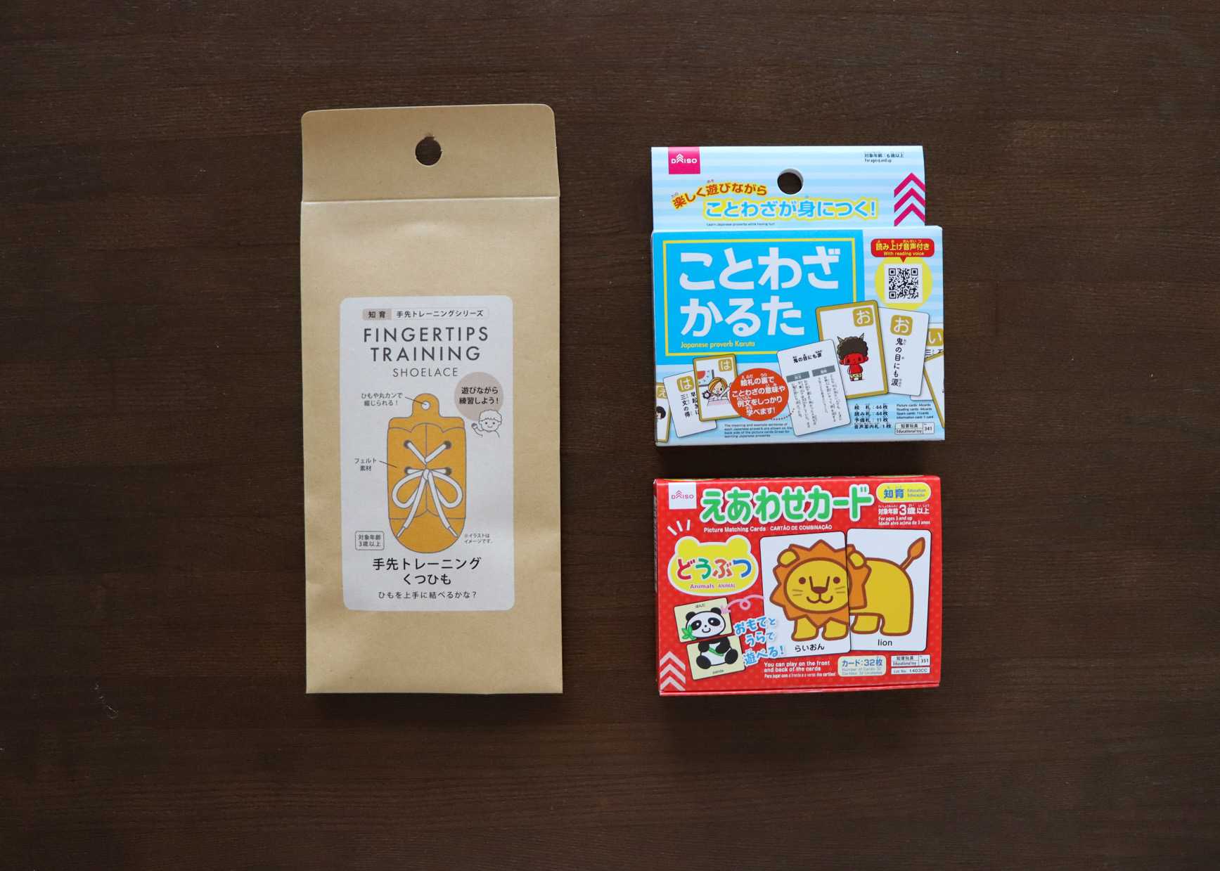 おはようございます。今日も私のブログを見に来ていただきありがとうございます。ネットで話題になっている指先の訓練的なアイテムが気になって、またまたダイソーへ行ってきました。5種類くらいある中から欲しかった靴紐結びを買ってきましたよ。あと、カードゲーム系も2つ。靴紐結びは、中はこんな感じ。自分でも作れそうとか言っちゃダメです(笑)作れそうだけど、材料揃えたりとかそういうのが面倒くさくて結局やらないから←百均でこういうの作ってくれて本当に助かります。早速、小5長男にやってみてもらいましたが一応蝶々結びはできるけど縦結びになるよねー(笑)小2次男にも練習させたいと思います。☆ ☆さて、我が家のリビングは先日カリモク60のKチェアが仲間入り。ソファ横にはちょい置きスペースとしていつ買ったのかも分からない古いスツールを置いていました。potato布で作ったクッションカバーがマスタードイエローとよく合うラプアンカンクリのリネンタオルはscopeさんで買うとtwiggyのマルチカバーが付いてきますよ関連記事:2022唯一の大物買い☆カリモク60 Kチェア買いました!このスツール。リモコンやSwitchのジョイコンなど細々した物を置いておくのにとても便利なのですがやはり面積が小さくて物が置き切れず、落ちたりソファの座面に散らかったり…もう少しちゃんとしたテーブルが欲しいなと思っていました。そうしたら!なんと、素晴らしいタイミングでこちらのテーブルをお試しさせていただく機会をいただきました。ひやー、ありがたい!なんだろう、今年はもう運を使い切っちゃったかな^^;一人でも組み立てられるということで、早速作り始めましたが下の段の取り付けに思いの外手こずりまして、結構大変だったー、汗汗そのせいか、作っている時の写真もなければ完成の写真すら撮り忘れるというあるまじき失態!唯一撮っていたのが緩衝材で遊ぶ三男(笑)何しとんねんー(;´д`)いやー、やっちゃいました。すみません。でですね、こちらが引きで見たリアルリビングなのですが、各種おもちゃがあちこち散らばっていまして、これを少しでも片付けたいなと最初、アンパンマンのおもちゃを下の段に入れてみたのです。高さびったびたですが入りました(笑)これもちゃんとした写真なくてすみません。私一体なにしてたんだろう…記憶が…_(:3 」∠)_このアンパンマンのおもちゃは最近は遊ぶこともほとんどなくてたまーに遊ぶくらいだったので、ここに片付いてくれてそれはそれで良かったのですが、ほとんど遊ばないのなら違う場所に片付けてこの便利な場所はもっと違うことに活用した方がいいのでは!?と思い始めました。そこで、冒頭ダイソーへ行った時にこの収納棚も買ってきていました。奥のボックスについてはあとでチラッと書きますね。このワイヤーの収納棚をテーブルの下段に乗せてみます。すっっっごいギリギリ乗りました!(笑)あまりにギリギリ過ぎて少しでもズレると落ちてしまうことから得意の魔法のテープと結束バンドで止めております。分かりづらいので、解説を入れますとほそーく切った魔法のテープを左右の足の下に貼り手前のテーブルの脚に結束バンドで結びつけています。これで動かなくなりました。2段にしたのはなぜか、と言いますとここに長男次男の本を置きたいと考えたから。この前、私と次男と三男の3人で過ごしていた時に、ゲームやYouTubeを1時間以上やってるし一回休憩ね、と次男に言って電源を消したのですが、じゃあ何したらいいの?と言われたんですよね。昨年、2階に子供部屋を作ってからは上二人の本もおもちゃも全部2階に持っていっていてリビングには何も無かったんです。小2次男は一人で2階で過ごすのがまだ怖いお年頃で誰か一緒に来てくれないと2階には行けない。三男のなんでもかじる病もおさまってきたし、もうそろそろ上の子たちの本をリビングに置いてもいいのかな?と思いまして今回このテーブルの下に置くことにしました。とりあえず手近にあった本を置いてみた図。本って、立てて収納するのがキレイだけれど、子供の本ってぐちゃぐちゃになって結局私が整えることになるからこうやって横向きに積んだ方がラクなんです^^;下に置いてるのは、学校からのお知らせを入れたクリアファイル。給食の献立とか日々チラッと見たいものを挟んで置いてます。ちなみに、上に乗っているのは、これまたダイソーのフェルトバッグ。ダイソーのペン立てと合体させるとめっちゃぴったりです。リモコンやSwitchのジョイコンなど細々したものの整理に活躍してくれています。これで、次男もリビングで退屈することがないね(^^)買ってきたカードゲームも置いておこ。縁が立ち上がっているから物が落ちづらくてすごく使いやすいテーブルです。子供たちの年齢差が大きいからみんなが快適に過ごせるリビング作りが地味に難しい我が家。その時々の状況に合わせて柔軟に変えられる収納で今は乗り切っています。皆さん