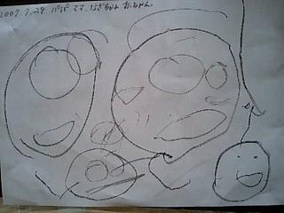 今日、いつものように広告の裏紙でお絵かきしてくれたのですが、こんな嬉しい絵を描いてくれました。最近、顔が上手になってきて、「これは誰?」と聞くと、「大きいのはパパ、ママ、小さいのはなぎ~ちゃん、あかちゃん!」と答えました。 3人書くことはあったけど、赤ちゃんを書いてくれたことが嬉しかったなあ~ もうお姉ちゃんの自覚できてきたのかな? 先日久しぶりに日記を更新して、北海道旅行記をつづったのですが。。。。なぎ~にパソコンの電源をオフされてしまい、あと少しのところで全部消えてしまいました。そのうち時間ができたら、また頑張ります いたずら なぎ~先週少しだけ美容院でカットしてきました。秋の七五三に向けて、あんまり短くできなかったよ。