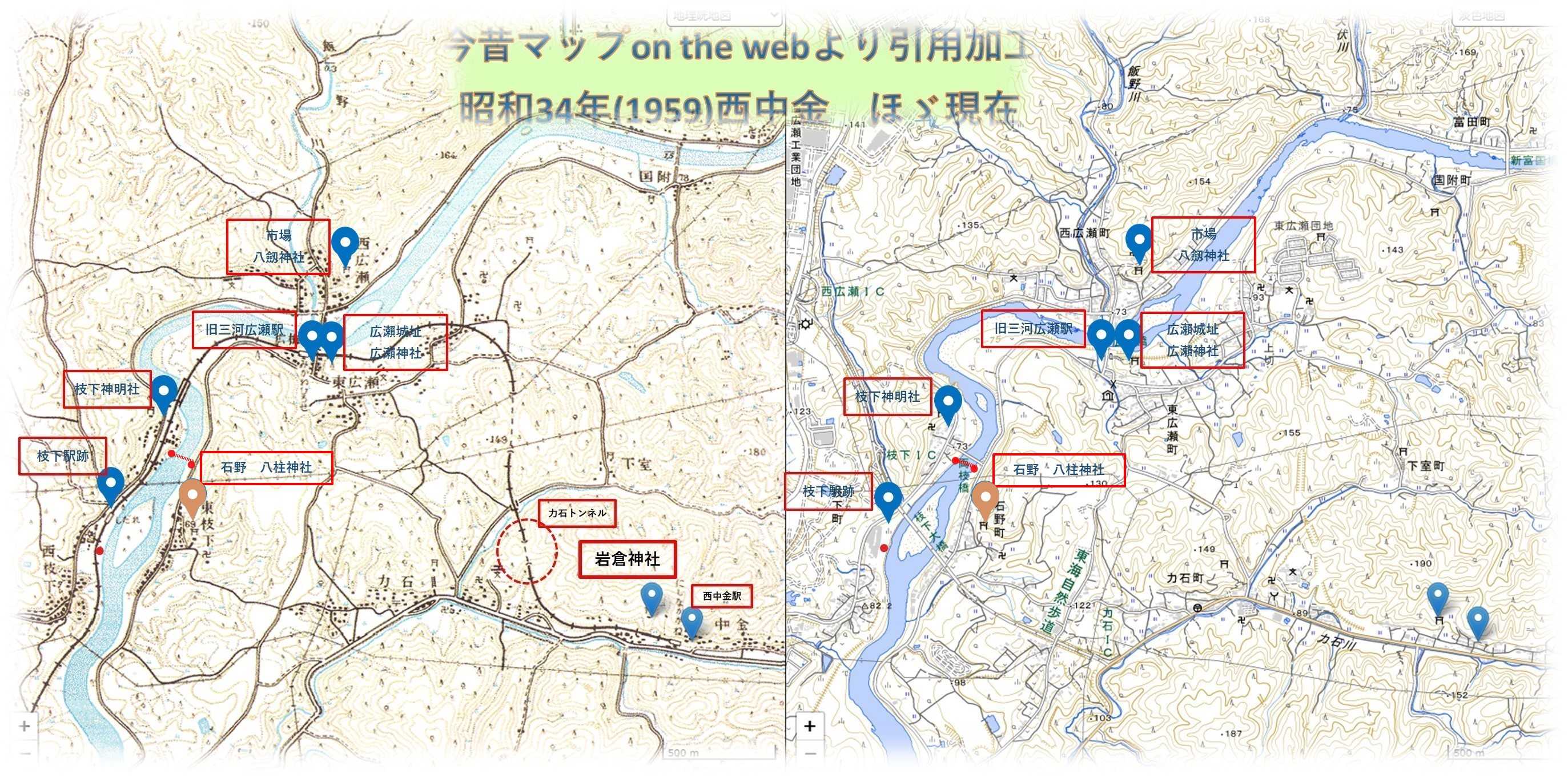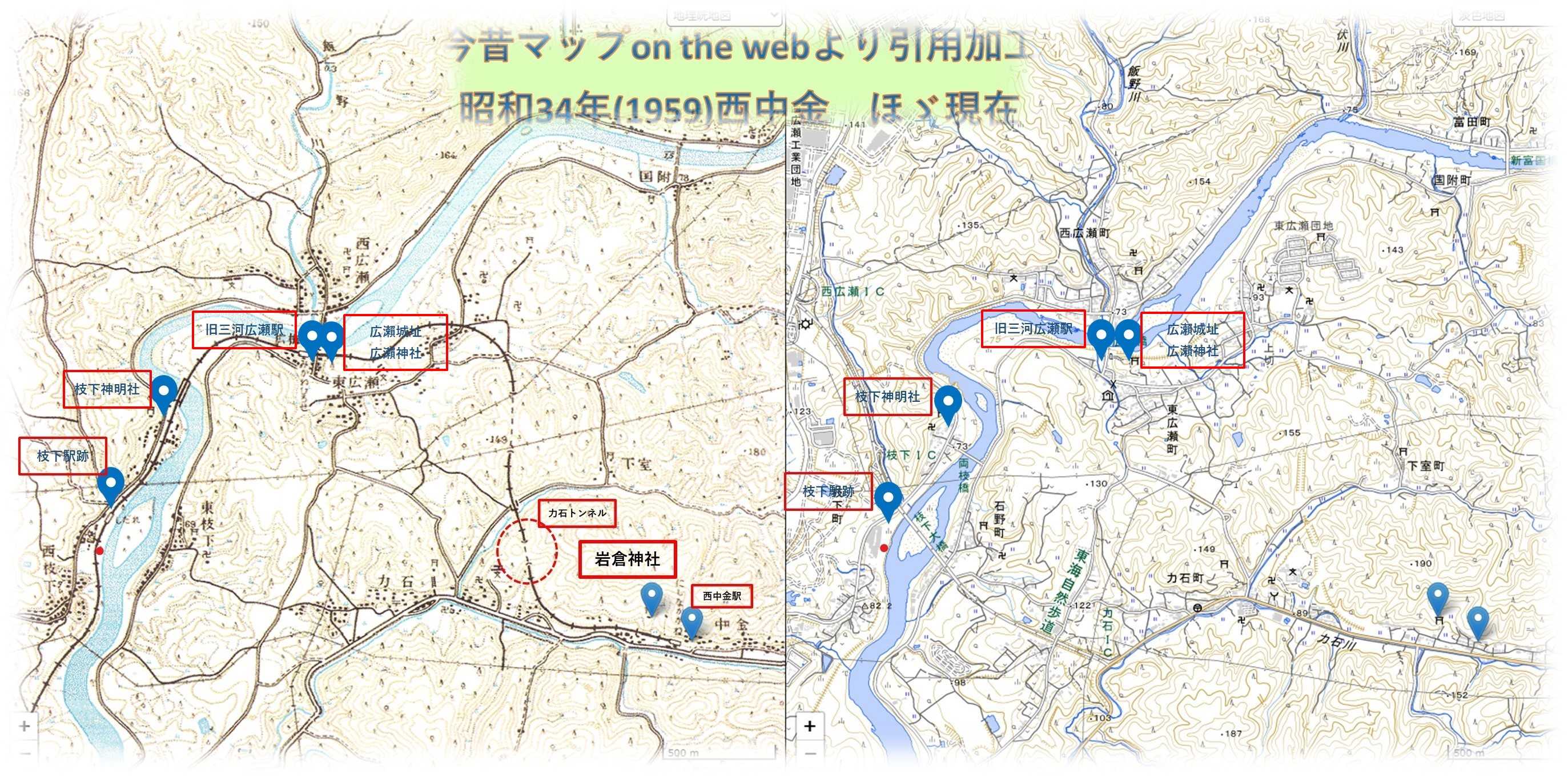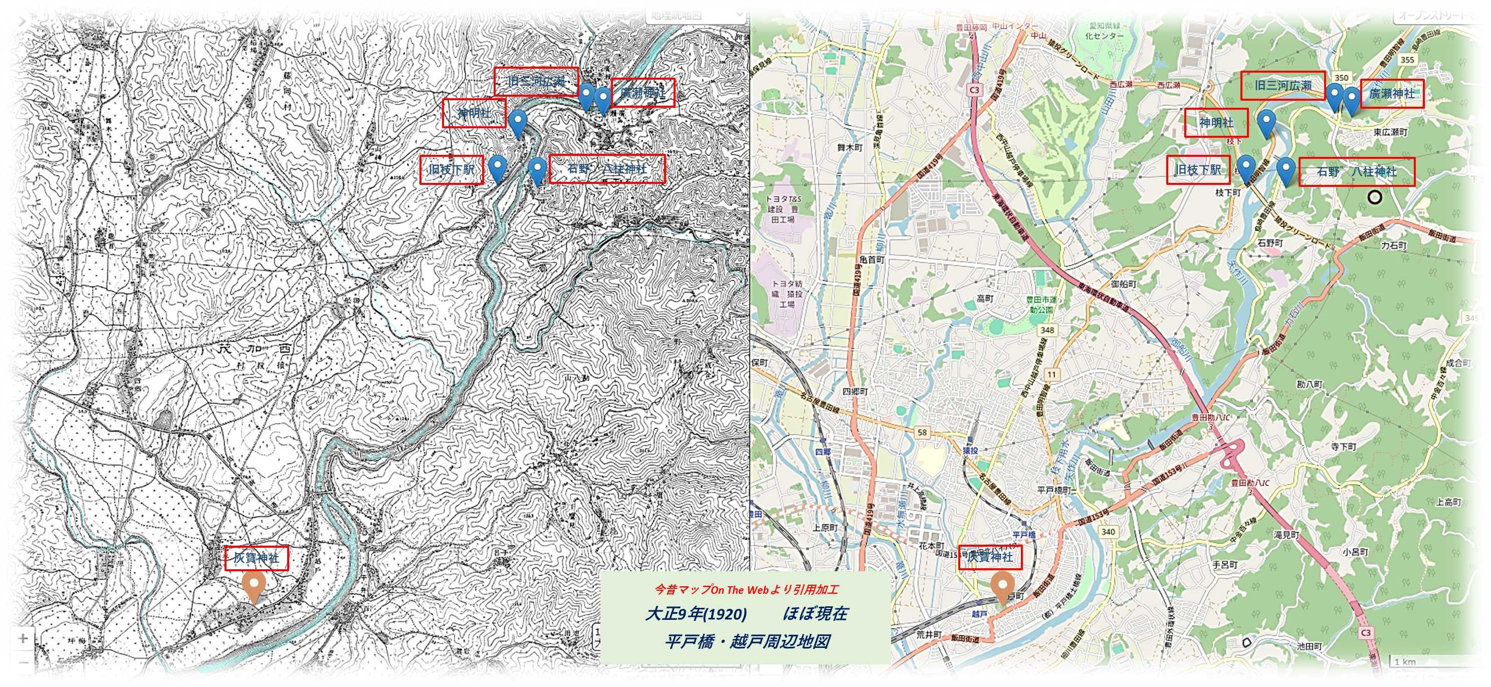 連日異常な暑さの日が続き、エアコンの効いた部屋から外に出ようなんて気が全く起こらない。万歩計の実績は4桁にほど遠い日が続き、そろそろ写真も底をつき、たまにはエアコンも休ませてやらないと機嫌を損ねると命取りになりかねない。無理くり外に出かけることにしました、もちろん車ですが、椅子を積み込んで昼過ぎに出かけました。場所は市内から猿投グリーンロードを使えば約1時間で辿り着ける、豊田市枝下にある旧名鉄三河線の枝下駅跡です。猿投グリーンロードの枝下ICで下り、信号を右折して、県道11号線を100㍍ほど走った左側の「わくわく広場」が枝下駅跡になります。駐車場もあり、矢作川が目と鼻の先を流れており、木陰に入ると心地よい風を感じられます。写真は対岸の力石ICを結ぶ枝下大橋。上は昭和30年代(左)とほぼ現在の地図の比較で、枝下駅跡は地図左側にあたります。左の地図には名鉄三河線吉良吉田駅から終着駅の西中金駅を結ぶ線路が描かれています。猿投駅から西中金駅間が廃線になったのは、つい最近の平成16年(2004)。目論見は紅葉の名所香嵐渓を持つ足助まで繋げたかったようですが、用地買収・不況の影響から頓挫、西中金駅から香嵐渓をバスで繋いでいました。国道沿いや矢作川にかかる橋梁を走る電車の姿を覚えている方も多いかもしれない。枝下大橋の少し上流に、対岸の三河広瀬駅を繋ぐ矢作川橋梁がありましたが、今はその面影はありません。 わくわく広場にある「枝下町の史跡と旧飯田街道」の周辺マップ。周辺の徒歩圏内には下流に旧枝下用水取水口、戸隠神社、弘法堂、上流に旧飯田街道唯一の渡船場跡があると記されています。左「三河広瀨」・右「御船駅」の行先表示板。駅舎は現存せずプラットホームと線路が残るだけですが、椅子やトロッコなどがあり、地元の憩いの場として活用されています。御船駅は県道11号線を猿投方向に5分程走った御船津島神社の先にあり。廃線以前は県道を横切るように踏切があり、滅多に電車が通過しないだけに、遮断機が下りるととても残念な気持ちになった場所です。現在踏切は埋められていますが、踏切脇には今も線路が残り、御船駅プラットホームも残ります。枝下駅プラットホームから三河広瀨駅方向の眺め。もう電車は通ることがないが、線路にはトロッコが置かれています。置かれているトロッコは、原則資材運搬用として残されているもので、乗りたければ止めないが、ご自身でリスク管理ができる方のみと注意書きが貼られています。自走できないので、人が押して動かすトロッコのようで、左手の木のレバーは恐らくブレーキだろうか。注意書き。事故等起きた場合はご自身の責任となっています。このトロッコ、私の推測ですが、周辺の雑草除去や旧枝下用水取水口の環境整備のための資材を運搬する目的ではないかと思います。地元の方の整備もあり、護岸は雑草は刈り取られ、矢作川の流れを身近に感じられます。このあたり、複数の枝垂れ桜が植えられており、桜の時期は色鮮やかな事でしょう。線路上を旧枝下用水取水口に向かってみます。歩く事数分で旧枝下用水取水口入口に到着。・・・入口にチェンが掛けられ「危険 立ち入り禁止」の札。取水口なんで付近の水深はそれなりにあるだろう、足でも滑らせ水難事故でも起こされては、そんなリスク管理からだろう。ならば、もう少し線路を進み「戸隠神社」を目指してみよう。緑のトンネルを抜け、数分ほど先に進み陽光が差し込む辺りまで向かってみる。周辺の建物からもこの先辺りが戸隠神社と思われる。線路脇の右手の高みが鎮座地だろうか、上に続く手摺があったが、雑草が生い茂っており「ようこそ」という感じでもなく、何より蛇の予感もするので諦めて戻ることにしました。しばらく戻ると上に続く道があり、そこから枝下公民館へ出ることができました。公民館裏手の「枝下用水灌漑」の案内板。この事業に尽力した西澤真蔵氏は、下流の平戸橋付近に鎮座する枝下川神社の祭神西澤真蔵命として祀られています。戸隠神社は近いはずなんだが、案内板も見当たらず、今回は諦めて車に戻ろう。枝下駅跡と旧枝下用水取水口訪問日 / 2025/08/08所在地 / 豊田市枝下町的場230-3過去記事・西中金駅舎・岩倉神社・岩倉神社農村舞台・枝下(しだれ)川神社
