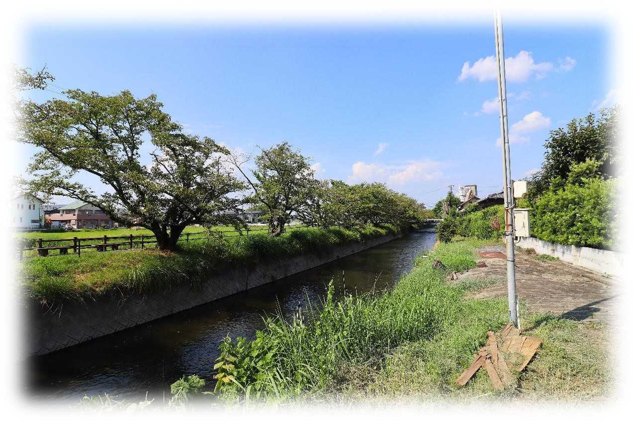 水神社・八大龍王社。 江南市曽本町幼川添地内を流れる五条川左岸沿いの堤に沿って尾北自然歩道が整備されています。自然歩道脇に小さな社が祀られています。曽本町幼川添地内の尾北自然歩道から、上流を望む。 住宅地を流れる岩倉周辺の川相とは様相が異なり、周辺には今も田畑が残っている。後で知ったことだが、この日は名古屋で気温が39℃を記録していたという。 直射日光は肌を刺すように痛く、スマホも熱中症にかかったかのようにまったく役に立たなかった。それでも、川沿いを吹き抜ける風は、アスファルトに覆われた街中で室外機の排気熱が滞留する風とは違い、どこか心地よさすら感じられた。五条川左岸の自然歩道沿いから、下流を望む。 静かな川辺の自然歩道沿いには、「八大龍王」の白い奉納旗が風にはためいています。ここが水神社・八大龍王社になります。 このあたりは、何年か前の10月ごろに久昌寺を訪れた際に歩いた場所で、堤沿いには曼殊沙華の小さな群落が点在しており、写真に収めたことがあります。水神社・八大龍王社境内全景。 一見すると個人宅の敷地に祀られた個人祭祀の神社のようにも見え、無断で立ち入ってよいものか、戸惑う佇まいです。 正面には石碑が置かれ、左側にひとつの社殿が祀られており、創建も新しいもののように見られますが、こちらの神社と久昌寺西側の龍神社は深い関わりがあるようです。その由来を伝える八大龍王御由来。『水神社・八大龍王社 尾張の国の曽木村を流れる幼川には、大昔から八大龍王の住むと伝えられてきましたが、誰もその姿を見た人はおりませんでした。 至徳(1384〜1387)という年号ですから、今から六百年以上も前のことです。小折村の久昌寺の前身である禅喜寺に、娘に化身して現れた八大龍王が、そのとき「私は幼川に住む八大龍王である」と言って三枚の龍の鱗を残し去り、大日照で困っていたお百姓たちに雨を降らせたといわれております。 その後、大和から小折村に移ってきた生駒家広という人は、とても信仰心が厚く、小折村に龍神社を建てると、ここ幼川沿いにも水神社を造り、こちらも八大龍王を祭ったと伝わっております。 それ以来、日照りのときにはこの両神社に雨乞いをすれば、必ず雨が降ったと、今日でも古老に信じられております。平成4年5月吉日』この解説に依れば文永年間(1469~1486)に、当地に移り住んだ生駒氏が創建したとあり、当神社の前身は鎌倉時代まで遡るようです。 目の前を流れる五条川、その西岸1kmほどの場所に生駒氏の拠点となった小折城跡があります。 その西隣り「龍神社」では、社頭の前に雨壺池が現存しています。そこには、「雨壺の水を手桶ですくい、曽本村の水神社に供え、五条川の水を持ち帰ると、龍が現れ雨を降らせた」と記されています。 八大龍王を祀る龍神社の社頭に湧き出る雨壺池と、曽本町の水神社が一体となって、八大龍王が地域の豊穣をもたらしていたというものです。玉垣に囲われた本殿域。 由来には「水神社・八大龍王社」とありますが、本殿はひとつ。社名札はなく、この社に二柱の神が祀られているのだろうか。 水神社は水を司る水神様の高龗神、罔象女命などが祀られます、一方の八大龍王は仏教から由来する水神様、このふたつの神がひとつの社に合祀される姿はあまり記憶がないかもしれない。 農業を営むものにとっては水は豊かな実りをもたらす上に必須。昨今は当地に雨が全く降らない日が続いています、雨が降らなければ農家は死活問題だ、神にすがるしかない。 小さな家庭菜園ですらそれは実感します、この暑さと雨不足ではものは実らない。この状況で米や野菜の生育がどうなるのか心配になってくる。 先日、矢作川を訪れましたが、心なしか水量は少ないようにもみえました。そろそろ水の神々に程よい加減の雨をお願いしなければならなくなってきました。補足。当神社へは車で行けますが、細い路地の突き当りとなり、転回スペースがありません、1㌔ほど西の久昌寺公園に車は停めて歩く事を勧めます。水神社・八大龍王社創建 / 文永年間(1469~1486)祭神 / 不明所在地 / 江南市曽本町幼川添58 久昌寺公園駐車場から水神社徒歩ルート / 県道172号線を曽本二子交差点を右折、100㍍ほど先で右折した突き当り。参拝日 2021/8/21過去記事・嫩桂山久昌寺・「龍神社」江南市小折町八竜・江南市 生駒屋敷跡・小折城跡・「神明社」江南市田代町郷中・生駒家の氏神として祀られた「南山神明社」