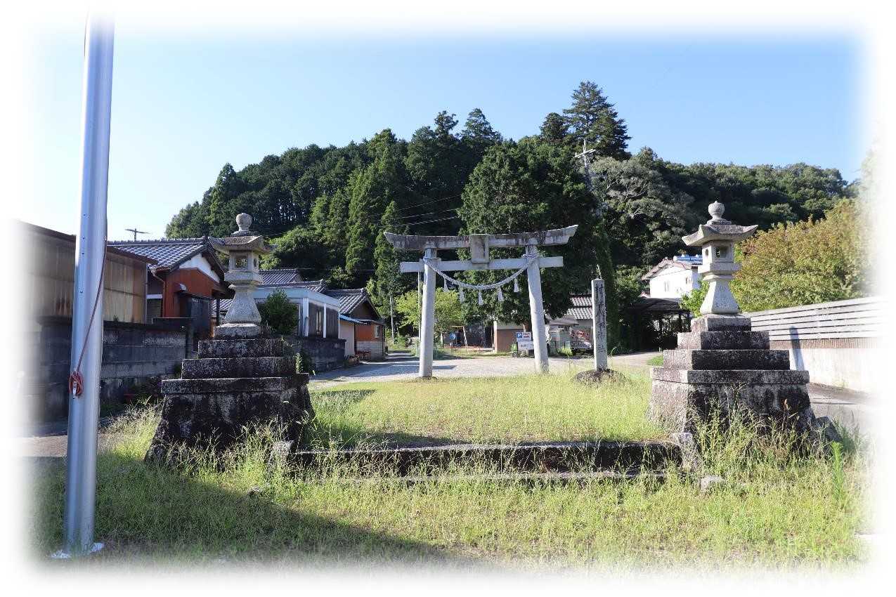 廣瀬神社からの続きとなる今回、車を駐車した旧西広瀬駅から広梅橋を越え、西広瀬町交差点を右折し100㍍ほど直進した左側に社頭を構えます。 駅から徒歩で約10分、車なら2・3分程の距離になります。県道脇の社頭全景。 駐車スペースは鳥居の先か、社地右側の細い路地を直進した先に参拝者駐車場が確保されています。社殿は正面に見える山の中腹に建てられています。上が市場 八劒神社の鎮座地で、東広瀬町の旧西広瀬駅から広梅橋を渡った対岸は西広瀬町市場地区になります。 過去には目と鼻の先の二つの集落を矢作川が分断し、お互いの城から対岸を睨みあっていた。鳥居から社殿方向の眺め。 左に「村社 八劒神社」の社号標、その先に明神鳥居が建てられています。鳥居の先の広場は、移動販売車の立ち寄り場所になっており、形を変えて市場の地名の名残を感じさせます。鳥居扁額は「八劒神社」と記されています。鳥居から先の参道は農村舞台が迫り出し、狭くなりますが、その先に広い境内が広がっています。手水舎と傍らの解説板。「八劒神社・農村舞台」の解説で、内容は以下。『八劔神社・農村舞台 入母屋造 茅葺(鉄板覆)瓦庇付豊田市には神社が370社あるが、八劔(やつるぎ)神社は市内に三社しかなく、建速須佐之男命が主祭神である。 八劔とは三種の神器のひとつ天叢雲剣のことで草薙剣とも呼ばれ、災難除けにご利益があるとされる。境内は本殿が小高い場所にあり、南側の一段低い部分に農村舞台がある。 舞台は本殿と拝殿を結ぶ軸線上に向かいあって建てられている。舞台の前には空間があり、 当時は地芝居、現在はふれあい祭りの観客席となる。 建立は棟札によって寛政10年(1798) 8月に地元大工と西広瀬村の組頭二名によって再建されている。舞台正面の若葉模様の彫刻から、江戸時代後期の特徴が見られる。花道、楽屋を備え、舞台を広くするための工夫(ガンドウ)もあり、また自然景観を舞台に取り込む装置(遠見の機構)もある。 この舞台は当地方では最も古く、豊田市内における初期の舞台形式が垣間見れる重要な遺構である。今後も地元民の手により大切にしていく舞台である。2023年10月 豊田市わくわく事業・名所旧跡の会 』舞台後方から社殿の眺め。 舞台裏側の迫り出した部分が楽屋だろうか。広場は公園としても整備され、境内には遊具が設置されています。農村舞台正面の眺め。 桁行5間(約9m)、梁間3間(約5m)と大きな舞台で、廻り舞台は備えていません。屋根を支える長い桁は一本の無垢材を使用し、前面に唐草模様が施されています。寛政10年(1798)に再建された舞台を見上げると、茅葺なのが良く分かる。 昨年、猿投山周辺の神社を巡り、農村舞台を幾つか見かけましたが、何れも鋼板で覆われたり、瓦に葺き替えられたものが多くなり、手間のかかる茅葺は、やがては技法も忘れ去られて行くのでしょう。舞台正面の社殿全景。 石垣で二段に分けて境内が作られ、拝殿まで石段が続きます。上り口から拝殿を見上げる。社殿全景。 切妻造の妻入り拝殿で、正面が格子扉、三方は腰板が張られた吹き抜けのもので、神明造の本殿と結ばれています。本殿の左右に境内社が祀られています。愛知県神社名鑑(1992)による神社の由緒は以下のように記されていました。 『十二等級 八釼神社 旧指定村社鎮座地 豊田市西広瀬町市場252番地 祭神 伊豆御霊命由緒 創建は明らかでないが、享禄(1528)から永禄年間(1569)まで御船城主の祈願所として社殿を造営した。 明治5年5月村社に列し、大正15年4月1日、供進指定社となる。昭和11年5月8日、幣殿を新築した。 例祭日 10月第二日曜日社殿 本殿 神明造0.83坪 幣殿 6坪 拝殿 23坪 社務所 8坪、神饌所 6坪、境内坪数 700坪 氏子数 90戸』とあり、創建は室町時代にまで遡るようです。内削ぎ千木と鰹木が飾られた神明造の本殿と境内社。本殿右の境内社。 境内社には社名札が掛けられていましたが、脱色しており読み取れなかった。一段目の境内に安置されている狛犬と農村舞台。 対岸には東広瀬城が迫っています。境内右手から社殿の眺め。 石垣の積まれ方はちょっとした城壁のように急角度で積まれています。市場 八劒神社と農村舞台創建 / 不明祭神 / 伊豆御霊命境内社 / 不明社2社氏子域 / 西広瀬町例祭日 / 10月第2日曜日所在地 / 豊田市西広瀬町市場252廣瀬神社から八劒神社 / 廣瀬神社から広梅橋を越え、西広瀬町交差点を右折し、100㍍ほど直進した左側。訪問日 / 2025/08/08・枝下駅跡と旧枝下用水取水口・平岩 神明社・旧名鉄三河線 三河広瀨駅・廣瀬神社・広瀨城趾・市場八剱神社と農村舞台
