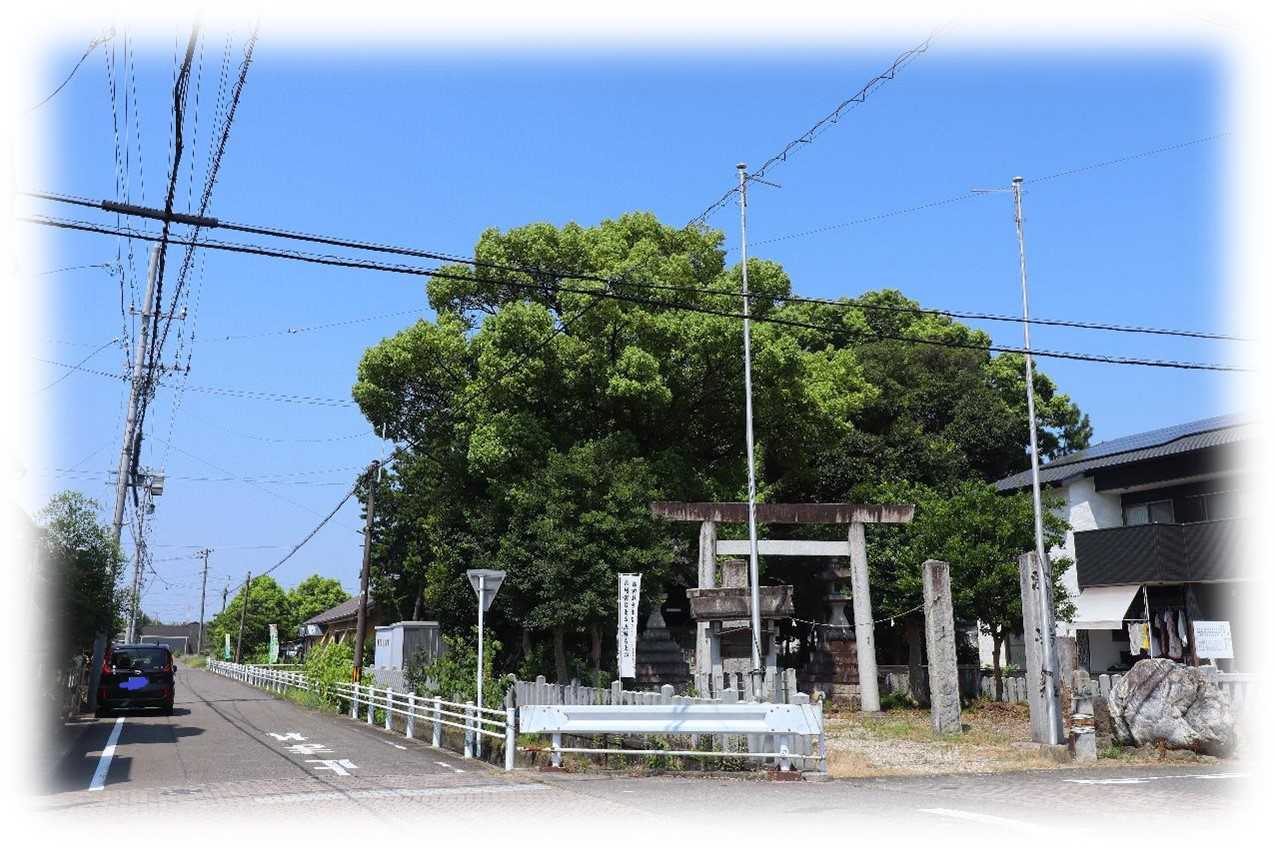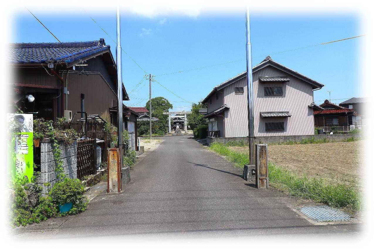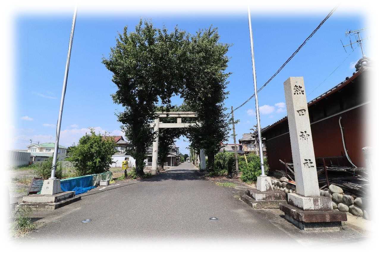 前回掲載した千秋町加納馬場郷内鎮座の日吉神社、今回はそこから車で2分程北東に位置する熱田神社を掲載します。鎮座地を明治初期の地図を見ると、加納馬場村の西外れの田畑の先に小さな集落があり、そこが現在の加納馬場字西切にあたります。写真は加納馬場大山地内の熱田神社社頭。右手に大正8年(1919)に寄進された「熱田神社」社標が建てられ、道路を跨ぐように石造の明神鳥居が立っています。熱田神社鳥居から参道の先の社殿方向の眺め。鳥居の前後左右に4本の樹(桜かな)が聳えており、枝葉は鳥居のように剪定されているのが印象的です。現在は生活道路となっている参道はかつては桜並木だったのかもしれません。玉垣で囲われた社地はここから約200mほど先にあります。こうした長い参道は郊外ならでは光景かもしれません。突き当りの熱田神社社地全景。注連縄柱の先の境内左に馬場公民館が併設されており、車はそちらに駐車させて頂きました。境内全景。建物は境内左に手水舎、右手に神楽殿、正面の社殿と社殿左に境内社が祀られています。手水舎と龍口。張られた清水は、鉢の底まで見通せるほど澄み切っていました。神楽殿。入母屋瓦葺の平入で、正面以外は腰壁が施された四方吹き抜けのものです。神楽殿内部全景。氏子達の手によるものだろうか、格子天井には書や絵が描かれています。拝殿正面全景。木造入母屋造で千鳥破風と大きな向拝を持つ風化のある佇まいで、手前で一対の狛犬が守護しています。寄進年を見忘れましたが、顔の表情が個性的な狛犬です。熱田神社社殿全景、由緒が見当たらず、愛知県神社名鑑(1992)から調べてみました。『七等級 熱田社 旧村社鎮座地 一宮市千秋町加納馬場字西切2167番祭神 日本武尊由緒 創建は明らかでない。貞和4年(1348)8月22日再建の棟札がある。「尾張志」に「山王権現社、天王社、熱田大明神社、神明社加納馬場村にあり」とある。明治5年村社に列格さる。昭和15年より同21年にかけて社殿、その他の改膳整備が行なわれた。同26年10月22日昇級及び整備完了報告祭を挙行した。例祭日 10月第3日曜日社殿 本殿流造3.3坪、幣殿5.5坪、拝殿24坪、社務所19坪、境内坪数409坪。氏子数 600戸』貞和4年(1348)再建とあることから、南北朝時代の尾張守護斯波氏の庇護を受けていたのだろう。西側から社殿の眺め。拝殿・幣殿がその先の流造の本殿につながり、周囲を透塀が取り囲んでいます。社殿左の境内の片隅に境内社が一社祀られており、社名を確かめに向かいます。板宮造りの本殿や献灯台には社名に結びつく手掛かりはありません、不明社です。拝殿前から神楽殿と長い参道の眺め、氏子達がつないできた神社の長い歴史そのものかもしれない。加納馬場 熱田神社創建 / 貞和4年(1348)再建の棟札祭神 / 日本武尊境内社 / 不明社氏子域 / 千秋町加納馬場例祭日 / 10月第3日曜日所在地 / 一宮市千秋町加納馬場字西切2167千秋町日吉神社から熱田神社・車ルート / 日吉神社から北東に約1km、2分程参拝日 2025/8/21関連記事・水神社・八大龍王社・曽本町 神明社・嫩桂山久昌寺跡と郷中神明社・千秋町日吉神社