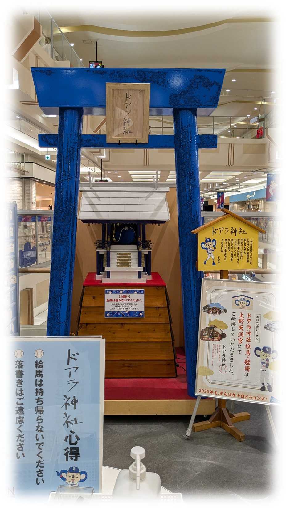 9月に入っても気温は相変わらずの体温越えが続いています。こうも暑いと外に出てウォーキングや神社巡りに出かける気にはなれない。冷酷無慈悲な万歩計は歩きが足りないと毎日催促してくる。最近はなまぐさになり、涼しい空調が効いた市内のイオンモールウォーキングで万歩計のご機嫌を窺っています。今日はAEON MALLナゴヤドーム前店を歩きに行ってきました。1Fから3Fのフロアを順路に従って歩くと一周1.2km、それを2周すると万歩計もご機嫌になる。ナゴヤドーム前店はドラゴンズの試合があると必ず利用しますが、店内にはラウンジや休憩スペースもあり、昼間の暑い時間帯をここで過ごす方も多い。イオンモールウォーキングルートの2Fのドラゴンズベース前に神社が鎮座しています。記憶では以前は1F南側の出入り口付近に鎮座していたはずだが、いつの間にかこちらに遷座したようです。ドラゴンズブルーの明神鳥居を構え、「ドアラ神社」の額も掛けられている。鳥居横の由緒書き。絵馬や短冊もあり、上野天満宮で御祈祷してもらえるようだ。ドアラは御存知中日ドラゴンズのマスコットキャラクターで、そのドアラはついに神となり祀られている。社殿は内削ぎの千木が付く神明造で、扉の前に御神体のドアラの尻尾が安置されており、願いをこめて尻尾に触るとなんでも叶えてくれる・・・らしい。今月応援に行く予定でいますが「なんとかブービー回避、願わくばCSシリーズ進出」、なんてお願いをしてみたものの・・・頼むぞドアラ。ドアラ神社創建 / 不明祭神? / ドアラ祭礼? / ドラゴンズ勝利当日所在地 / 名古屋市東区矢田南4丁目102-3 イオンモールナゴヤドーム前