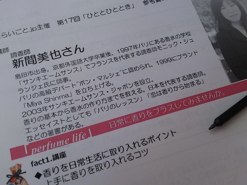 香りは私の中で重要なポディション好きな香りと苦手な香りがあり その時の場面と香りは記憶に残るのだあの時の香りこの香りはあの人と同じ香水とかこのお香は母が買っているお線香と同じあの時もこの香りがした…と言う具合に場面と香りの記憶って残るものだ私の使っている香りはChanelのマドモアゼルココこれは発売当初からお気に入りでずっと使っているボディクリームと夏の香りなのか夏になると限定でパウダーが販売されるどんな香りかと言うとフローラル系で甘すぎず 大人っぽい上品な色気のある香り大好きなのパフュームライフ 香りのセミナーに行って来ました講師は 新間美也さんパリ在住 日本では東京ではなく島田の家に先生は東京には住めないのだとかパリは都会でもマルシェがあったり緑の多い公園が沢山あり不便な事も沢山あるが心が休める所があるパリに在住されているそうです日本では香水原料が入手困難な事もあり仕事もパリが拠点となるとか今回のセミナーは興味深いお話で時間もあっという間でしたフランス人は香りで楽しむお料理を見てフランス人の第一声は「美味しそうな香り」から味、盛り付け、日本人はお料理をみて「きれい!美味しそう!」から香り、味となる香りって好き嫌いがあって好きな香りをまとう事によって精神がリラックスし女性はホルモンのバランスが安定したり好きな香りは生活の上でとても大切な役目をしているのだと今回先生が新年の静岡のセミナーと言うこともあり新春のイメージして香りを調合して下さった杉、檜のグリーンな爽やかな香りにバニラ、ジャスミンの香りが入り柔らかい落ち着いた香りに男性でも着けられる香水との事女性の香水もほんのり香るのも好きだがセンスの良い香水をつけている男性がとっても素敵男性で素敵な香りがする人って少ないのよね爽やかな香り言いかえると軽い香りの香水をつけている男性(若者に多し)私たち世代の男性だったら深みのある香水をつけて頂きたいものだそうディオールのオーソバージュあの森瑤子先生が愛用していた香水だ男性向けに作られた香水だが大人の女性にもあう香水私も興味があってディオールカウンターで試してみたのだが私のイメージではなかったあとシャネルのブルーは好き マドモアゼルココに少し調合が似ていると思うのだ こうなると自分用の香水欲しくなりますよねオリジナルの香水が作る事が出来るそうですオリジナル オーダーしましょうか?