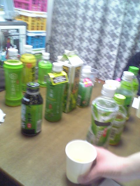 友人達と誕生会をやったのです。 1月生まれの俺もおまけで含みます♪ 毎回趣向をこらしたプレゼントが用意されているのだけど、 今回はスクープ取材用のマイク(笑)をもらった。 声を変えたり、バキューンとかアハ~ンとかいう音が出るボタンがついてる。 どこで使おうか。。。 長丁場の大貧民大会も盛り上がったけど、 今回一番燃えたのは「第72回 チキチキ 利き茶選手権~!」 スーパーでありとあらゆる緑茶を買ってきて利き茶をやったのです。 その数13種類!! やり方は、まず目隠しをしてお題のお茶を少し味わいます。 その後、並べられた13種類のお茶から、味覚・嗅覚などを駆使して お題のお茶を探し出すのです。 「私が飲んだのは、この生茶ではありませ~ん!! ポイッ!」みたいに♪ 初めて本格的に利き~をやりました。 結構自信があったんだけど~ きっとお酒が入ってたからね~ きっと花粉症で鼻が効かなかったのさ~ などと色々と言い訳を並べてみても 結果は散々でした(涙) これ難しいわ。ホント。 当てられる友人を見てちょっと尊敬。 以外に味覚たいしたことねーなー、と自覚した夜でした。 茶王にはなれず。でも違う王にはなれるかな?