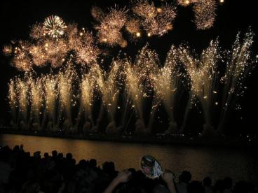 すごかった。私の人生の花火ランク、堂々の1位に踊り出た花火だった~。というのも、予定より遅れて開始30分前に会場付近に到着したので江戸川の堤防沿いはほぼ満席。。しかし、2人だしきっと隙間があるはずとずかずかと人込みのシートの中を進んでいき堤防の斜面に隙間を発見周りの人にお願いしてその隙間にちょっと御邪魔させてもらいました。もう、打ち上げ場所のまん前の特等席。唯一の欠点は斜面だから滑って座りにくいこと。前のおばちゃんも座るのを断念してたからスペースが空いてたのねいや~、でもあの迫力を体感するためなら、それくらいの苦痛も我慢しますよ。花火は圧倒的な打ち上げ筒本数で、いったんスイッチが入ると爆発的に花火が打ちあがるのです。色使いもカラフルで、テーマに沿った趣向ある花火と構成。そして、アナウンスのお姉さんのはじけっぷりも面白かった。大満足です。あ、でももう一つこの場所に欠点が。。。風下に陣取ったばかりに、花火の燃えカスや灰が大量に降ってきたのです。。。周りのシートには灰が積もり、身体もザラザラでした。さながら、日本沈没で海岸で救助を待つワンシーンのようでもありました。(何十万の人と赤く燃え上がる空と降り続く灰。。なんてね) 写真はもっとたくさん撮ったので時間を見て追加UPしたいです。