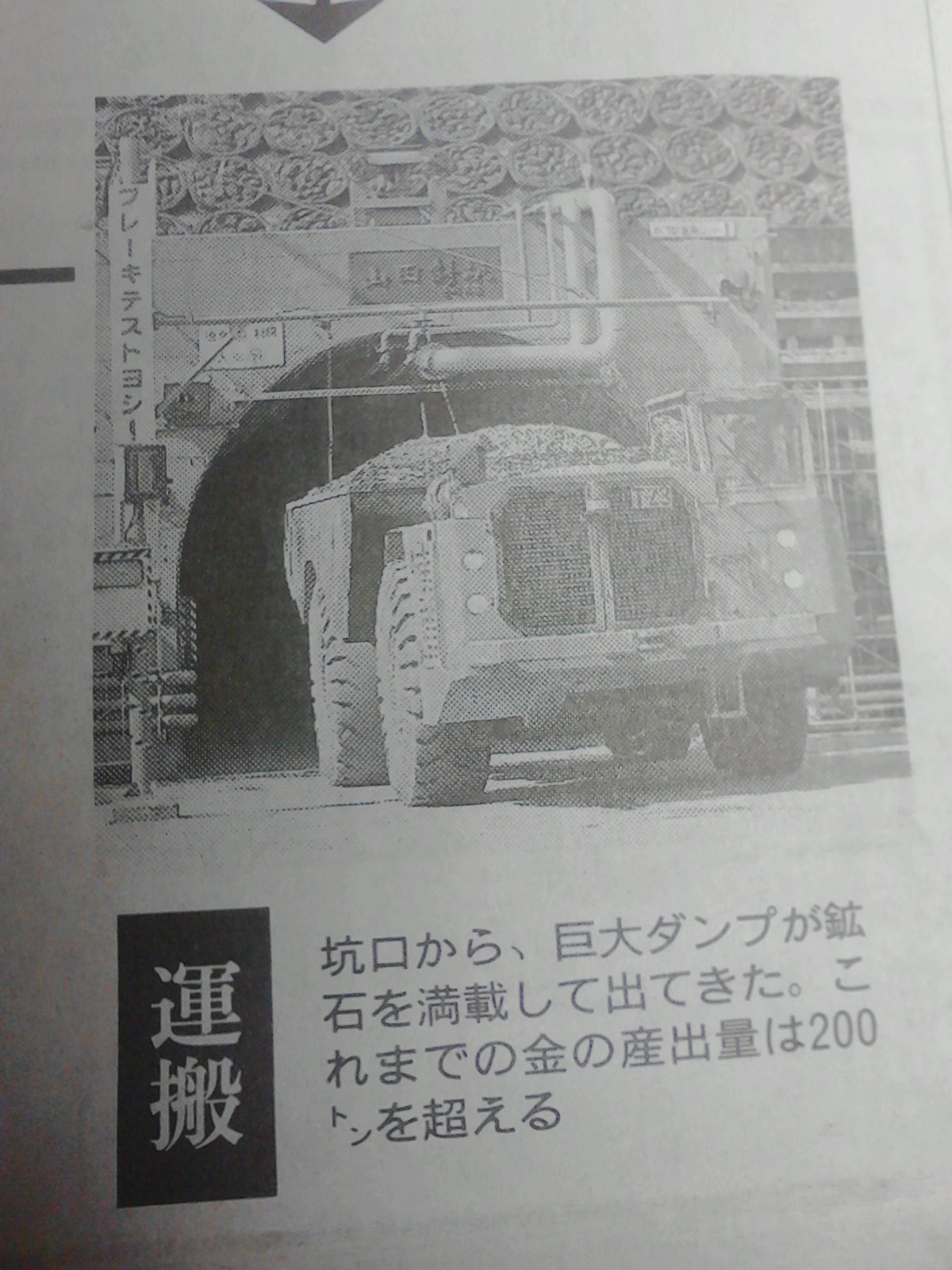 金は、歴史的に、金箔の漆器や屏風などの日本の伝統文化や欧米の意匠や装飾品として利用されてきたと思います。これは金が、化学反応を受けにくい、極めて安定した金属であったことが原因だと思います。歯科領域で、金歯に利用されるのも、この安定した性質のためではないでしょうか!図3 運搬 坑口から、巨大ダンプが鉱石を満載して出てきた。これまでの金の産出量は200トンを超える図4 選別 地上に運ばれた鉱石は、ベルトコンベヤーへ。熟練した女性作業員が、ズリと呼ばれる捨石を素早く取り除く。この後、トラックと船に乗せられ、愛媛県の精錬所まで運ぶ。