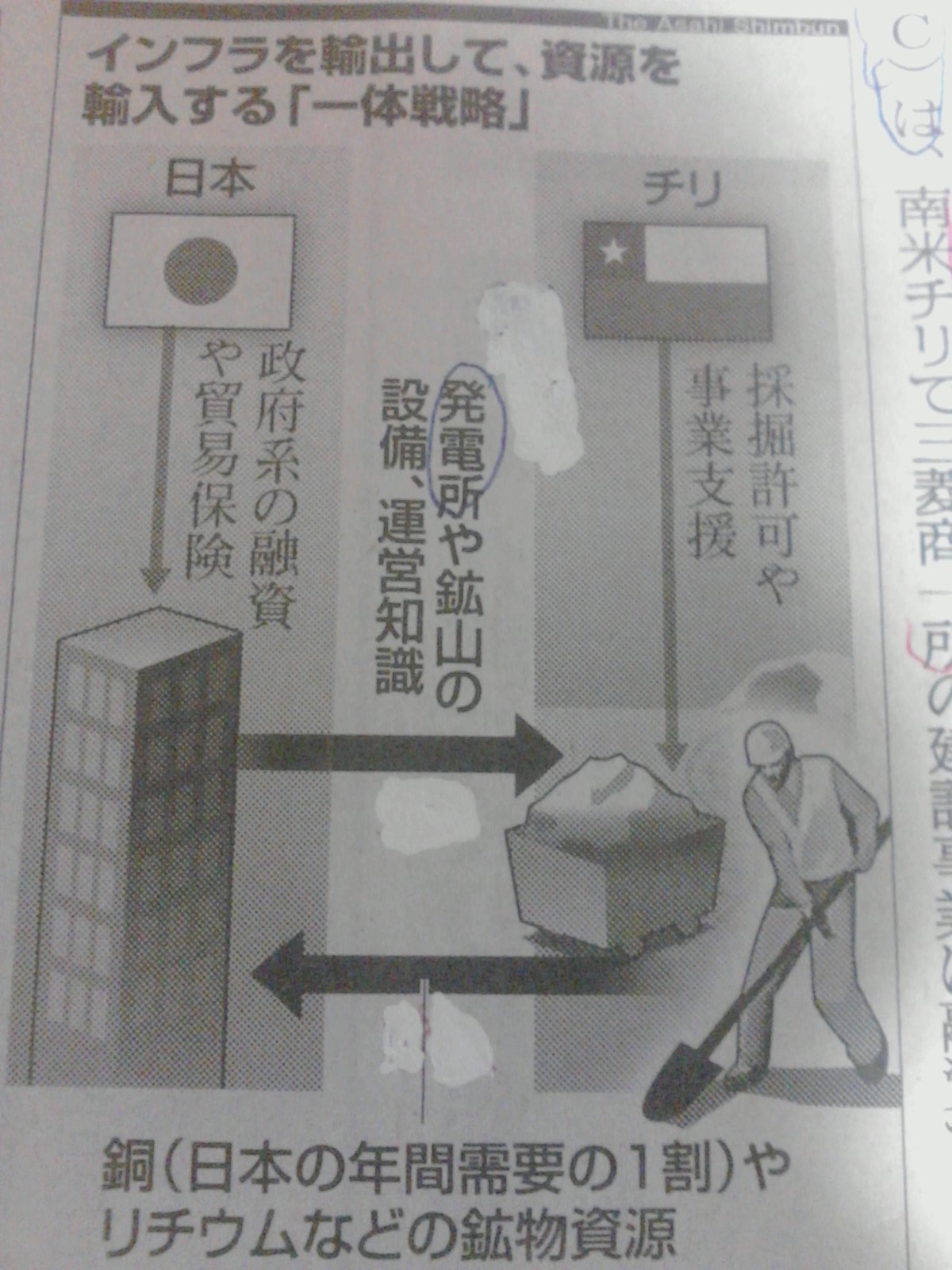 朝日新聞3月28日_2013年チリの鉱山で、従業員が地下深くの一室に閉じ込められ、奇跡的に救出されたことは記憶に新しいところです。事故の再発防止の観点から、日本の持っている鉱山の設備、運営知識が、チリに対して寄与し得ると考えています。また、現在、日本のTPP参加が既に加盟している国々によって、承認されました.TPPの参加国の一つがチリであることから、、発電所の輸出と資源の確保を一体に支援する資源外交の事例がチリとの間でなされていましたので、記載することにしました。記憶が定かではないのですが、チリとの間にはFTAが成立していたのではないかと思います。(FTAが成立していると、効率よく銅を入手できるのではないかと予測しています。)資源外交の金融的側面は、旧政策投資銀行内の国際協力銀行部門が担っていることは、広く知られています。国際協力銀行(JBIC)は3月28日にも、チリ北部の「コクラン石炭火力発電所」(発電容量47.2万キロワット)の建設計画に対する最大5億ドル(475億円)の融資を決める。日本の大手民間銀行なども別に5億ドルを貸出し、邦銀の融資分には日本貿易保険(NEXI)が貿易保険をつける。発電所は2016年から発電を始める計画で、電力の大半は近くのシエラゴルダ銅鉱山で使われる。鉱山は住友金属鉱山や住友商事などが開発を進めており、JBICなどが昨年3月、鉱山事業に対する最大10億ドルの強調融資に応じた。新興国で安定的に資源を確保するため、JBICは、発電所の輸出と資源の確保を一体で支援する。 これによって、日本の銅の年間需要の約1割をまかなうという。貿易保険(NEXI)が貿易保険をつけるということは、発電所建設や鉱山開発あるいは輸送や治安などで、通常の保険では保障しきれないプロジェクトであることを示していると思われます。(ソマリア沖に出没する海賊被害に対して貿易保険が適用されていますが・・)貿易保法の第5条、第7条、第13条、第15条から第20条までを参照してください。