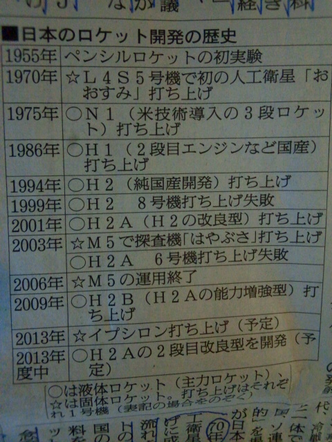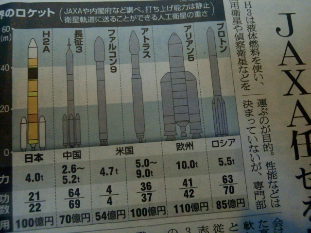 JAXAは、独立行政法人であり、評価委員会により、財務・会計の監査を受けなければならないことが、JAXA機構法で定められているので、欧米に比較して割高のロケットの打ち上げ価格を民間の協力を得て、下げて、衛星の打ち上げ需要に答えていこうという方針であると解せられますが、このブログで、日本のロケットの開発の歴史を概観した後、次のブログで打ち上げ市場について、考えようと思っています。国の宇宙政策委員会は28日、専門部会を開き、H2Aの後継となる主力ロケット「H3」を開発することを決めた。新たな主力ロケット開発は約20年ぶり。2020年度の打ち上げを目指し、来年度予算案に関連経費を盛り込む。技術力の獲得を目標としたこれまでの開発と異なり、コスト削減が最重要課題だ。従来の開発主体である宇宙航空研究開発機構(JAXA)まかせにせず、民間企業の関与を強めるという。 背景:宇宙基本計画より1.JAXAの中期目標(JAXA機構法に記載されている)は宇宙基本計画(宇宙基本法24条による)に基づくことが規定された。2.JAXAが内閣府設置法で内閣府のコントロールを受けることになった事から、JAXAの主務大臣は、内閣総理大臣になった。3.民間事業者の求めに応じて援助や助言を行う業務がJAXAに追加され、従来の主務大臣である文部科学大臣、総務大臣と連携して、新たに内閣総理大臣と経済産業大臣がJAXAを活用して産業振興を行うこととなった。日本のロケット開発の歴史 日本のロケット開発は、1955年東京大の糸川英夫教授が手がけた長さ23センチのペンシルロケットの発射実験で幕を開けた。60年代、冷戦を背景に軍事技術と一体で開発を進める米国、ソ連に対して「平和目的」を掲げて追いつくことが日本の目標となった。70年、重さ24キロの初の人工衛星「おやすみ」打ち上げに成功。「ペンシル」の流れをくむ固体燃料ロケットの開発を続ける一方、米国の技術を導入し、液体燃料を使った大型の主力ロケットの開発も進め、94年、念願の「純国産」H2の初打ち上げに成功した。主エンジン「LE7」は芸術品とも言われ、技術は世界水準に達したが、打ち上げ費用の高騰や事故で引退。2001年からは海外製部品を使ってコストを抑えたH2Aにマイナーチェンジした。現在、さらに高い技術力が求められる、人が乗るロケットの基礎研究が行われているが、国は有人宇宙開発全体について経費を圧縮する方針だ。1.日米衛星合意および日米衛星調達合意(1990年)により、日本は、実用衛星の打ち上げや利用ができない状況になっています。経済団体連合会もこれらの合意を外してくれることを求めていますが・・・・最近の月の探査衛星「かぐや」も月表面の探査後は、実用衛星に利用されることなく、破壊されました。2.宇宙条約に基づいた「平和利用」目的に沿い、憲法9条の精神での試験研究開発衛星に集中して打ち上げ技術を高めて来たと考えられます。
