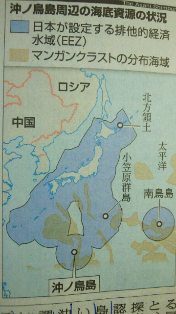 最南端の島 巨大岸壁 朝日新聞2013年3月21日沖ノ鳥島について: 東京の南1700キロ、小笠原群島の父島から900キロにある無人の珊瑚礁。東西約4.5キロ、南北1.7キロで、ハワイとほぼ同じ北緯20度の熱帯にある。満潮時も沈まないのは北小島と東小島だけ。登記簿上の広さは計9平方メートル。侵食で水没の危機にあったため、国が1987年から消波ブロックやコンクリート護岸で2島の周りを囲んだ。チャンネルNIPPONからの観測施設の画像を次に示します。国交省「資源確保」 経産省「使わない」国土交通省の主張「輸入頼みの資源を自前で開発する拠点。経済的な安全保障につながる」 6畳ほどの絶海の孤島に長さ160メートルの岸壁を造る。総工費750億円という巨大事業は海底資源の確保が主な目的だ。2016年度末までに、サンゴ礁を水深8メートルまで掘り、全長130メートルの大型海底調査船が停泊できる岸壁を造る。燃料や水の補給施設も備える。 重機や資材を置く陸地はなく、作業は船上か海中に限られる。台風の時期や冬場は海が荒れるため、工期は春先から夏までだ。 コンクリート製と鉄骨製の岸壁のどちらが早く造れるか検討中で、今シーズンから建設を本格化させる。国交省によると、沖ノ鳥島周辺の海底には、ニッケルやコバルト、白金などの金属を含んだアスファルト状のマンガンクラストが広く積もっているという。独立行政法人「石油天然ガス・金属鉱物資源機構」などの調査を基に、島周辺の排他的経済水域(EEZ)の海底からの資源発掘で1160億円の利益が出ると国交省は見込む。 海底開発を進めるには地質調査が不可欠なのに、本土と沖ノ鳥島を船で往復するのに5日はかかる。基礎調査をする文部科学省は「燃料の補給ができる拠点があれば、効率的な調査ができる」(海洋地球課)。国交省も「本土の近海に比べて調査が進んでおらず、レアアースが見つかる可能性もある」と期待する。経済産業省の主張海底資源が見つかっても、民間企業が参入して商業ベースに乗せなくては意味がない。だが、商業利用を前提にEEZでの調査を進める経産省は「沖ノ鳥島周辺はあまり注目していない」と冷ややかだ。 マンガンクラフトに含まれる物質のうち、リチウムイオン電池などに使われるコバルトは特に価値が高い。ところが、沖ノ鳥島周辺はコバルトの量が少なく、経産省はコバルトが多い南鳥島や沖縄周辺を重視している。経産省の担当者「資源と言うからには質や量が大切だ。いいものがたくさんなければ我々は行かない」。この朝日新聞の記事では資源の問題だけが取り上げられていますが、海洋法条約から解釈すると、もし沖ノ鳥島が、温暖化により水没してしまうと、日本の領土でなくなります。海底資源だけでなく、EEZ内の水産資源も喪失してしまいます。また、防衛上も問題が生じてくるという危惧がチャンネルNIPPONに記載されていますので、その意味について、後2回連続して考えてみたいと思っています。