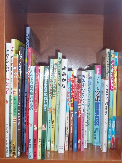 お子達の絵本の一部。この中に子供が読むものじゃないだろ!っていうのが1冊あります。わかった人には、噂のさばカレープレゼント!(うそ)↓実家からもらってきた図鑑シリーズ。なんとこれまた30年前のものです。兄よ、覚えているかい??ターはこれの動物図鑑を見るんだけれど表紙が……↑「サル、こわい~~」と言って、見れません…。確かに、ちょっとこわいかもしれないな。そういう図鑑シリーズとか絵本シリーズとか以前実家から、じじばばが持ってきてくれたんだけれど2代にわたって見れるなんて、買ってくれた親に感謝です。そろえると、結構な金額になるのに、買った親はすごいなー。火事で燃えてしまったけれど国語とか、英語とか、勉強シリーズもあった。持ってくればよかったなー。私もお子達にそういうシリーズ、買ってあげたいな。お子達の子供も、いつか見るかもしれないし。ノブは今日も遊びに行きました。今日は同じクラスのMちゃん(女の子)ちにばぁばと一緒に行ってます。女の子と約束して遊ぶなんて今のうちだけなんだろうな~。ターは今日はお熱で、保育園お休みです。元気だけれど、38度もある…。疲れかなー。子供の頃見た本で、お子達にも見せたい本「ちいさいモモちゃん」「ランドセルは魔女」