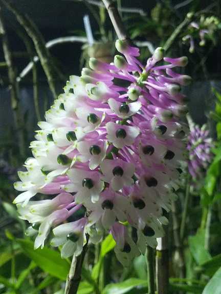 着生ランで葉の落ちた古いバルブに花を付けます。