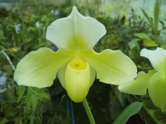 パフィオペディラム属の交配種、ツヤ・イケダ'オーイソ'です。
