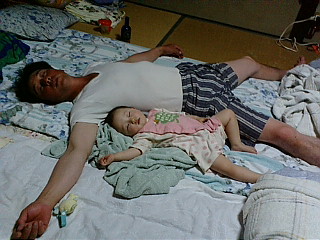 こんばんは。おかーさんです。実は金曜日さーちゃんは熱を出しました(お~、久しぶりだぁ)。その日は保育園の七夕会。祖父母参加の行事だったので、じーちゃんばーちゃんはわくわくしていたのです。登園後、おかーさんのケータイに電話。保育園から。さーちゃん、39度の熱。。。じーちゃんばーちゃんが保育園に行っているのでとりあえず任せて11時頃お迎え。病院に行って、「夏風邪かな~」と、お薬をだしてもらう。じーちゃんばーちゃんはそのまま七夕会に参加。残念ながら「ことりぐみ」のステージ発表はさーちゃん不在、離乳食タイムも他の子供たちの様子を見ていたじーちゃんばーちゃん。ごめんね、来年もあるから、それまでのお楽しみにしててね。熱は翌日も39度を行ったりきたり。日曜日には下がって元気、元気。暑~い日だったので肌着一枚で過ごしました。夜中は暑いせいか何度も目を覚ましていたさーちゃん。。。そして、今日は保育園復活。お迎えに行ったら眠っていたさーちゃん、ラックから先生が抱っこしても先生からおかーさんにバトンタッチしても眠っている。。車に乗せても眠っている。。帰ってきても眠っている。。。起こしても起きない。。ゆすっても抱いても声をかけても。。そして今23時過ぎ。まだ眠っている。。。前にもいちど保育園から帰って眠りだして朝まで寝ちゃったことがあったけど、今夜もきっと朝までだな。ゆうべ良く眠れなかったのと保育園の時間が長くなって疲れが出てきたのかな?おとーさんも一緒になって眠っているのですが、DNAのなせる技「シンクロナイズド・スリーピング」をご覧ください。。息の合った演技。すばらしいおまけ。さーちゃんの「ゴクゴク・・ぷっはー 」
