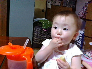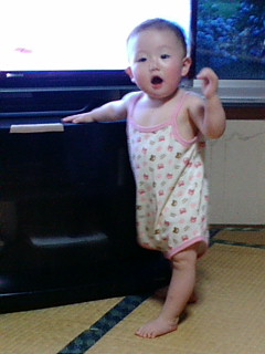 こんばんは。さーちゃんです!毎日暑いわね!盛岡もやっと7月らしくなってきたわ。いよいよ夏祭りのシーズン。12日、保育園では「夕涼み会」があったの。おかーさんが「おにぎり作り」のお手伝いをするから、って3時頃から保育園に行って、1時間ばかり先生と遊んでいたの。お手伝いが終了すると夕涼み会が始まって、おかーさんとお外に出たわ。おとーさんとばーちゃんが来ててびっくり。さっそくばーちゃんに抱っこして、おかーさんは屋台の食べ物を買いに走ってたの。おとーさんは缶ビールがあればOK。お天気が良くて、かといって蒸し暑くもなく、風があって気持ちいい夕方だったわ。ステージでは先生たちが踊ったり、各クラスの発表があってもりだくさん。なんと「ことりぐみ」もステージに登場よ。バナナの形をした車に乗っておかーさんに引っ張られてステージに上がったの。車を降りて抱っこされて、おかーさんが私のお名前とチャームポイントを話していたわ。私のチャームポイントは・・「右のほっぺだけにできるえくぼ」ですって。。。おかーさんは、保護者の中に同業者をいっぱいみつけて楽しそうにおしゃべりしてたわ。良かったわね。結局六時過ぎまで保育園にいたんだけど、楽しくて楽しくて全然ぐずらなかったわ。帰りの車に乗ったら即効で睡魔に襲われて・・・そのまま朝まで眠り姫コース。何だか眠りすぎたせいか、今日の日記はテンションが上がらないわ。ごめんなさいね。。。おかーさんは次の土曜日は職場の系列施設の夏まつり、その次の土曜日は職場の夏まつり。忙しいのね。。。いいわ、職場の夏祭りにはばーちゃんに連れてってもらうわ。実はおとーさんとおかーさんは、おかーさんの職場の夏祭りで出会ったらしいわよ。・・・おっと、バラしちゃったおかーさん、こんど自分で説明してね甚平デビュー。いかが?