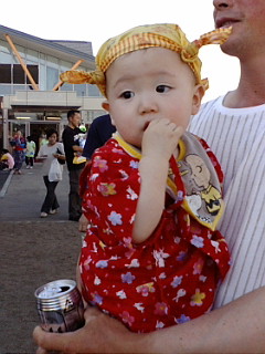 おかーさんです。盛岡も夏らしくなりました!でも朝夕はけっこう涼しいよ。最近、忙しいです・・。12日の保育園の夕涼み会に始まり、3週続いた毎週土曜日の夏祭り。締めくくりは8月2日。「盛岡さんさ踊り」です。さんさ踊りって?・・・詳しくは後日うんちくを述べさせていただきます。とにかく「太鼓」と「横笛」と「手踊り」が集団でパレードします。町内会や会社などのグループで参加します。8月1日から4日間、盛岡の目抜き通りを夕方から夜にかけてパレードです。おかーさんは地域のさんさ踊りの会で参加します。笛です。太鼓も笛も踊りながらなので、けっこうハード。仕事とさーちゃんの育児で練習はなかなか出られず、直前になって練習に出てみたら・・・げ、やばい。笛はなんとか吹けるが、踊る足がついてこない・・・よろよろしている。。。当日、大丈夫かね~・・。おとーさんは去年まで太鼓を叩いていたけど、今年はやはり多忙につき練習が間に合わず、グループの先頭で横断幕を持って歩くことに。さーちゃんはおとーさんに抱っこで参加してみることにしました。わくわく。そう、私たち夫婦は、けっこうなお祭り好き。私はおとーさんと知り合うまで、自分がお祭り好きとは知らなかった(笑)。おとーさんに付いていっている間にお祭り好きになったのかねな?さんさ踊りも、「踊る」なんてあり得なかった私なのに、今じゃ踊りまくり、笛までふくようになってしまった。昔の私はこんなキャラじゃなかった?はず?9月には秋祭りもあるのよ~。こちらも笛やる予定~。あはは。地震にまけるな、岩手。盛岡。元気よくいこ~!