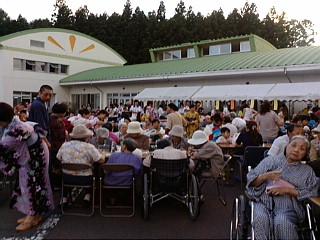 こんばんは。おかーさんです。今日はおかーさんの職場の夏祭りでした。ここ数日雨が多くてすごくじめじめした不快な天気が続いていましたが、今日はカラリと晴れて絶好の夏祭り日和。このにぎわいです。おとーさんは毎年地元の青年会で屋台のお手伝いに来ているのです。そして、ステージになっているのは大型トラック。実はこれ、おとーさんの会社(自営業です)の車両。今日はおかーさんもトラックに乗っておとーさんと一緒に出勤。奥のステージがおとーさんのトラック。この位置にびしっと停めるおとーさん、毎年惚れ直します。おかーさんは大型車両を運転できるヒトに弱いのだ。。そして屋台でやきそばを作るおとーさん。前にさーちゃんが「おとーさんとおかーさんは夏祭りで出会ったらしいわ」ってばらしてたでしょ。そうです、おとーさんが夏祭りのお手伝いに来ていたのがそもそものきっかけ。当時、青年会で独身はおとーさんくらいしかいなくて、青年会の皆さんが「ここの若い職員さん、どうだい」って、職場でも独身は当時少なくて、なぜか私が「どうだどうだ」言われて。。。からかわれている間にそうなってしまいました(笑)。施設の行事のときは忙しくて疲れるけど、お年寄りさんたちも私たちも、遊びに来てくれたお客さんも、楽しい時間を過ごせるのがいいですね。特に、職員の浴衣姿はお年寄りさんたちには新鮮なようです。さーちゃんもばーちゃん・ばーやんと一緒に遊びにきたよ。赤ちゃんせんべいぱりぱりしながら歌謡ショーをみて手をパチパチしてました。