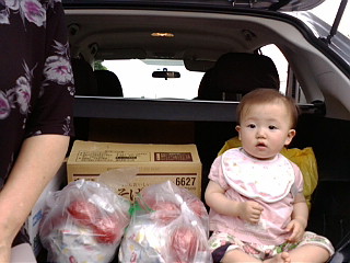 こんばんは、さーちゃんです!元気もりもり、絶好調よ!実は昨日、 私の誕生日だったの!でも昨日は地域の運動会があって、特にお誕生日イベントはなかったの。ところが、運動会から帰ってお昼ごはんを食べてお昼寝したら、写真屋さんに連れて行かれて。。。いきなりピンクのドレスを着せられてびっくりしたわ。でもね、やっぱりスタジオのお姉さんたちのテクでちゃんと笑ったわよ。お昼寝してミルクを飲んだからゴキゲンだったのよね。どうやら「お誕生日記念」の写真だったらしいけど。。ドレスのあとはなぜかチャイナ服を着せられて(おとーさんが選んだのよ!)またまた笑顔でサービスよ。おかーさんは満足してたけど、さて、どんな仕上がりになるかしら。楽しみだわ。写真出来上がったらブログにアップするって。皆さん、お楽しみにね。そして今日はお誕生日パーティー。朝からばーちゃんとおかーさんはパタパタしてたわ。お昼に釜じいと釜ばあが来たの。何だか色々持ってきて「おめでと~」って。私、お誕生日は初めてだから、何が始まるのかちょっとドキドキしたわ。浴衣に着替えて、ばーちゃんがお餅を私に背負わせたの。重かったわ~。立ってみせれば良かったのかもしれないけど、目の前のおもちゃに気をとられてお座りのままだったわ。そしてケーキが出てきて、ろうそくを「ふー!」。私はまだできないから、ばーちゃんがかわりに消してくれたわ。一通りの儀式(?)が済んだら、眠気におそわれちゃって。。。私が眠ってる間に、みんなはパーティーしてたらしいわ。。大人って、ずるいわ!ま、私ももう一歳。いよいよ「赤ちゃん」から「こども」に移行していくわよ。みなさん、お楽しみにね~そうそう、お誕生会の様子の写真は、おかーさんったらデジカメじゃなくてフィルムのカメラで撮ったから、現像しないとアップできないって。。こっちも後日、おたのしみに~!!釜ばあの車、トランクも広いわね!荷物といっしょに私ものせっててよ!