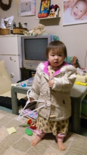 こんばんは!さーちゃんです!元気もりもり、春が近づいてわくわくしているわ。今日1歳8か月になったの。あっという間ね。・・こう言うと、おかーさんが「私なんてあっという間に今年37よ!」ってキレるのよ。やれやれ。相変わらず成長いちじるしいわよ。やることがすっかり「女の子」になったわ。保育園でも家でも、人形のお世話が大好き。得意なのはおんぶと寝かしつけよ。まかせて。そして、おかーさんのドレッサーでメイクもばっちり。ファンデーションを手に持って、スポンジを「ちょんちょん」して顔に「ぱたぱた・・」。そしてリップブラシで口紅。ちゃーんとおかーさんのやり方、見てるんだから。おかーさんったら、「さすがに私ので遊ばせるのはヤバい。こども用のおもちゃの化粧品ってないかしら・・」だって。イヤよ、そんなの。この間は、寝る前にいきなりファッションショーをはじめちゃったの。おかーさんが同僚からもらったお下がりのお洋服、「まだサイズが大きいから・・」ってしまっていたのを見つけて引っ張り出したわ。いいお洋服なんだもん、着てみたくなったのよ~。どう?ワンピースの裾からパジャマが見えるのはご愛嬌。そんな私だけど、相変わらずアンパンマン大好き。最近はキティちゃんにもハマってるわ。・・やっぱ、まだ子供ね。そして、チャレンジ精神も旺盛。ズボンを脱ぐのはできるようになったし、はくのはちょっとお手伝いしてもらえばできるわ。そして・・最近興味があるのは「オマル」。これが「しっし」するものだというのは分かってるわよ。座って「しっし、しっし」ってマネをして遊んでるの。でね、いちどおかーさんが試しにズボンとパンツを脱がせてから座らせてくれたんだけど・・・便座がつめたいのよ~!おかーさん、カバーを付けてないんだもん!いやだわ、もう。。ドジなんだから。。。保育園でも、私がズボン下げるしぐさでモゾモゾしてたら先生がトイレに連れて行ってみてくくれたの。うまくいかなかったけど、もしかしていつかできるようになるかも!がんばるわ。さて、いよいよ春が来るわね!おとーさん、おかーさん、今年の春は私、おそと走ってあそびたいわ!いろんなところ、連れてってね!今日釜じいと釜ばあが会いに来てくれたの。おみやげのベビープーグッズがいろいろ入っていた大きな紙袋、私もすっぽり。楽しいわ~。ありがとう、釜じい、釜ばあ!