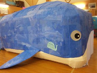 こんばんは!さーちゃんよ。インフルエンザも無事乗り切って元気いっぱい。インフルエンザから復活してすぐ保育園で「こどもまつり」があったの。文化祭のようなものね。インフルエンザの流行で、先生たちは行事をやるかどうか迷ったみたい。園児のほぼ半数がかかったんだって!でも当日までには流行の波は去ってくれたので・・。先生たち、私たちのためにがんばってくれたわ。今年のテーマは「ぼくらのアクアミュージアム」。水族館ね。まず目を引くのがホール中央のでっかいクジラさん。お口から入ってみると・・中はなんと、大水槽・・ってイメージ。みんなが作った海の仲間たちよ。思わずキョロキョロ・・しっぽの方には滑り台つき。もちろん、何回も滑ってみたわ。しっぽから中を見るとこう。真ん中の筒みたいなのにはイルカさんが入ってるわ。「旭山動物園のアザラシみたい~」って、おかーさん感動してたわ。おかーさんったら、クジラの中に入ったとたん「うわー、すごいー!うわー!」って・・うるさいのなんのって・・。もうひとつおかーさんが感動してたのは・・・園児全員の手形で作った「スイミー」。すごいわよね~。矢印の先が私の手よ。拡大してみる?これよ。おっきいクラスのお兄ちゃんお姉ちゃんの手はやっぱりおっきいわね。目になっている黒い手形は、たぶん園長先生よ。そして、お店屋さんごっこ 私たち「ひよこぐみ」は、「リッツ」にジャムをはさんで「リッツサンド」を作って売ったの。ただいま準備中~牛乳瓶のフタで作ったお金を持って、ばーちゃんとお買い物へGO!ひとつ上の「りすぐみ」さんで、お団子を購入。お金を渡したわ。10円でーす。おうちに帰ってからも「お店屋さんごっこ」は続いたわ。「いらっしゃいませー」。あ~、楽しかったわ~。元気になって「こどもまつり」に参加できてよかったぁ。おかーさんも楽しみにしてたもんね。お店屋さんで、いっぱい買い物してたわよ。さて、その他の展示。おかーさんが後日お迎えのときに撮ったの。私たち「ひよこぐみ」が作った「タコさん」。ことりぐみさんの「ホタテ」。大きいクラスの子たちが作った「マンボウ」ヤドカリやヒトデ、みんなが作った作品がいーっぱい。さて、来年はどんなテーマでやるのかしら。先生たち、アイディアしぼってね。去年もそうだったけど、今年も夢中になってあそんだわ。ありがとう、先生!