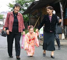 こんにちは。おかーさんです。10月に入り、めっきり秋らしくなりました。早ければ来月にはもう雪のお便りができるかも・・・やばい、急いで秋を満喫しないと。10月10日、さーちゃんの七五三参りをしてきました。七五三ってほんとは11月15日だと思いますが、このあたりでは寒くなる前に今頃の時期に済ませることが多いようです。朝、釜じいと釜ばあが来てくれて、みんなで写真屋さんへ。いつものスタジオではない所だったので、慣れない場所と雰囲気にさーちゃんびびって、なかなか着替えができない・・・焦る。。釜ばあが、メイク室にあるドレスやら帽子やらをとっかえひっかえ出して見せ、気を引いて何とか立ち直り着替えとヘアメイク完了。ありがとう。助かったわ、釜ばあ。祖父母4人に両親、さーちゃん、総勢7人の家族写真を撮影。さーちゃん1人の写真も少し撮って終了。そして、いつもの盛岡八幡宮へ移動。ばあちゃんたちと手をつないでゴキゲン。晴れ着は、おかーさんが35年前に着た着物。釜ばあ、とってもうれしそうでした。大安だったこともあって、七五三の子どもさん達もたくさん、結婚式も数組入っていたようで大賑わい。込み合っているのでおとーさんとさーちゃんが前列に座り、その他大勢は後ろへ。祝詞を聞いている間「頭をさげていてください」と言われ下を向いていると・・・隣でじーちゃんが「さーちゃん寝てる、危ない!」とささやく。前を見るとさーちゃん思いっきり舟をこいでいる・・・背もたれはないし、後ろにひっくり返りそう!ひええ~!おとーさん、気づかないのかぁ?!おかーさん、2列後ろから立ち上がって「おとーさんっ!」と小さく叫ぶ。よかった、おとーさん気がついた。さーちゃんも目を覚ました・・・・ほっ。後から聞いたら、おとーさんも寝てしまっていたそうで・・・バチあたりめ・・・無事に玉串も捧げて終了。女子4人でパチリ。そして全員でパチリ。みんな、にこにこですみなさん、さーちゃん無事に七五三を迎えました。すくすく元気に育っています。ありがとう!これからもさーちゃんの成長を見守ってくださいね