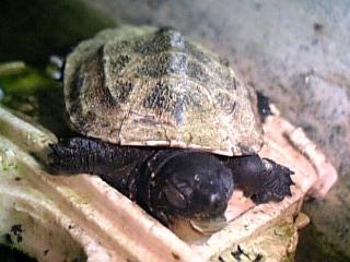 ゼニがめの武蔵です。よろしく。実はバイト先のホームセンターで売られていたのですが、病気になってしまい治療のため別の水槽に移されていたんですが、このままじゃ治りそうも無く買い手も付かなそうだったので私が引き取ってきました。アゴのところが裂けて口がちゃんと閉まらないのでかなり見た目かわいそうなんですが、しっかりエサは食べるので一安心かと…。今は甲羅の大きさが4cm弱、猫どもに合わせるのはまだ早いと思われるので顔合わせはまだまだ先になりそうです。
