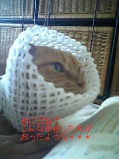 この前、はじめ♪さんのところのちょび太を見て、やってみたくてやってみたくて・・・やってしまいました。とらちゃと言います。よろしく。この白いやつデカ過ぎ!!別にとらちゃの顔が小さい訳ではありません。白いやつはメロン用の物です。
