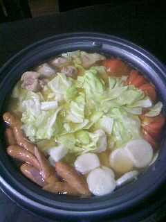 昨日の晩御飯レシピですこのくそ暑い中、何を思ったか急に鍋が食べたくなって冷蔵庫の中を見るとトマトが4個。オクラが一袋。大根半分。キャベツ一玉。ウインナー一袋。貝柱6個。で、冷凍庫にとりもも肉半分。在庫処分も兼ねて、コンソメベースのスープでポトフ風にしてみることにトマトはくし切りに。オクラは塩でもんで軽く下茹で。大根は5ミリ幅に切って半月切りに。キャベツは半分をざく切り。ウインナーは斜め切り。貝柱は横に切って、薄さを半分に。とりもも肉は解凍してから一口大。ベースのだしは、沸騰したお湯にブイヨンを3個、塩、コショウ、ローリエを一枚。軽く沸騰させて、味見て、ちょっと薄味くらいにしておくといいかも。うちの鍋用の鍋は電気なので、切った野菜をそのままぽいぽいと入れていく。で、そこに出来た出汁をじゃーっとそそぐ。で、電源を入れて約5分。こんな感じで、出来上がりましたベースはコンソメなので、飽きたときには柚子コショウを入れても。で、締めのお楽しみはご飯とバターと入れて、いい感じになったら卵溶いて入れて。それと同時にとろけるチーズも投入♪30秒ほど経ったら、火を消してお玉でひと混ぜ。リゾット風おじやが出来ます♪トマトの潰れたのがだしに馴染んで、めっちゃおいしい♪人が来たときにも簡単に出来る料理なので、是非試してみてください