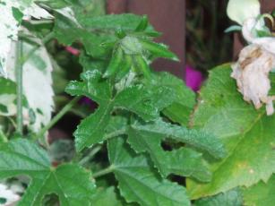 おはようございます。昨日、帰りが遅くなったので朝6時から水やりをたっぷり与えました。夏場と違って土の乾燥が遅くまだ、脱水状態になっていませんでした。植物たちも秋を満喫しているようです。・・・以前に寄り添っています。と書き込みしました。その苗から、蕾が出ていました。アップにします。どことなくハイビスカスのような蕾です。でも、葉はハイビスカスでないような気がします。もうすぐ花が咲いてくれると思います。そうしたら判明するかもしれません。植えた覚えがないので贈り物です。早く花咲かないかなぁ!楽しみです。では、今日も一日がんばりましょう。