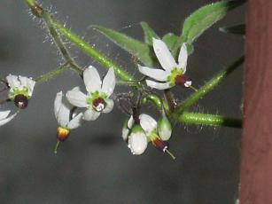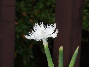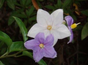 ツルハナナスです。最初は、紫で咲いて、徐々に色が白に変化します。その時間差がうまくできて、こんな花が撮れました。手前が咲きたて、真ん中が、少し前に咲いたもの秋ならではで、寒くなってきて生長が緩やかになって花の寿命が延びてこんなシーンが見れます。移り色の楽しみの一つです。