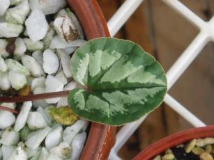 こんばんわ。今日も日中奥さんは、ご機嫌斜め・・・。でも、仕事ですのでほっといて行きました。昼休みに気になり一時帰宅、40分ほどで職場へ・・・。帰宅後は、ピザが食べたいと言い出し、1万円置いていつもの卓球クラブへいきました。2勝して帰宅。食卓を見たら4枚のピザとサイドメニューが・・・。きれいにお札使いました・・・。(ビックリ!)まぁ、年間通してそんな無茶しないと思うので・・・。それで少し機嫌が直ったかなぁ・・・。機嫌治るのに3日掛かりましたね。・・・さて、今日も原種シクラメンです。今回は、コウムです。しかも、特殊なタイルバーン・エリザベスという品種です。簡単に説明・・・黄緑色がかった小さめの銀葉に、緑の縁取り、そして複色(ピンク縁のバイカラー)の花という両方の特徴を持った株のみを呼ぶ。そのうちの葉が出てきました。花はさすがにまだ出てきません。基本種とは、葉の色合いが全く違いますね。コウムとはいえたくさんの種類が存在します。原種シクラメンって知れば知るほどたのしい植物です。では、今日も1日お疲れ様でした。おやすみなさい。サクラソウ科の塊茎性多年草です♪庭植えできる唯一のシクラメンです。原種シクラメン コウム白花 【山野草】サクラソウ科の塊茎性多年草です♪庭植えできる唯一のシクラメンです。原種シクラメン コウム赤系 【山野草】