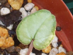 おはようございます。今朝は、昨日からの雨も止んで曇ってます。が、まだ、これから降るようですね。予想最高気温も、25℃で、ここの所では、一番低い温度になりそうです。・・・さて、原種シクラメンもいよいよ本格的に動きだしてきました。これからは、原種シクラメンの話題が増えそうです。本当にそれぞれ個性があるので、見ていて飽きません。今回は、原種シクラメンのひとつ、ミラビレです。発芽当時は、バイカラーで出てきて、熟成すると緑色になります。角度を変えて・・・。これが基本色なのですが、ミラビレの中でも種類があってタイルバーン・ジャン(白い花)タイルバーン・ニコラス(銀葉で中央が、緑) タイルバーン・アニィ(全くの銀葉)などあります。中には、葉が生まれたての時にピンクで出てくる品種もあるようです。まだ、花は出てきていませんが、時期的にはそろそろなので開花が待ち通しいです。では、今日も一日がんばりましょう。宿根なので寒さに強く・来年も咲きます香りがある原種シクラメン苗(プルプラセンス・ヘデリフォリウム・シリシウム・ミラビレ・コウム)