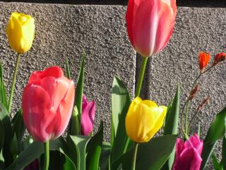 おはようございます。今日は、すごくいい天気。外に出ていても気持ちがいいですね。そろそろ暖かくなっていくのかなぁ。・・・さて、今日は、元気なこの方々です。大輪のチューリップの赤です。こちらは、色々な色を寄せ植えにしています。が、一斉に揃って咲かなかったので失敗・・・。この方は、ミニチューリップです。昨年もこのままで咲いていたので2年目になります。ミニチューリップは、強いですね。掘り上げなくてもちゃんと咲いてくれます。そして、同色の寄せ植え。こちらは、揃って咲いてくれたので見応えがあります。やはり、一斉に咲いてくれる方が見応えありますね。ひとつずつ咲いて、プランターの花が長く咲いても寂しいので来年以降同色をたくさん植えようと思いました。では、今日も一日がんばりましょう。