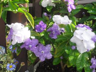 こんばんわ。今日は、窓を開けておくと涼しい風が部屋を吹き抜けていました。こんな天気が続くといいのですが、そうはいかないようです。四方を山で囲まれた京都の町ですので、すり鉢状なので熱がこもります。今の季節は、風で拡散はされるのですが、夏 風が止むと蒸し暑い状態になります。ですので、この風のある季節を大切に過ごしたいと思います。でも、明日は早速雨です。週間予報でも2日雨、2日晴れ、また2日雨です。梅雨の走り?かなぁ・・・。・・・さて、今日は、ニオイバンマツリです。甘い香りが漂ってきています。最初は、この色。そして、明日は、薄くなり3日目には、白色に変化します。ので、一株で青と白の花が楽しめます。また、明日以降に変化があったら載せていきます。お楽しみに。では、今日も一日お疲れ様でした。おやすみなさい。ニオイバンマツリ(3号)【エントリーでポイント最大19倍】ニオイバンマツリ Sほのかに香るあまーいかおりが特徴ニオイバンマツリ(樹高 0.4m内外)ほのかに香るあまーいかおりが特徴ニオイバンマツリ(尺鉢)