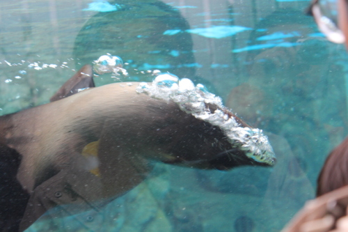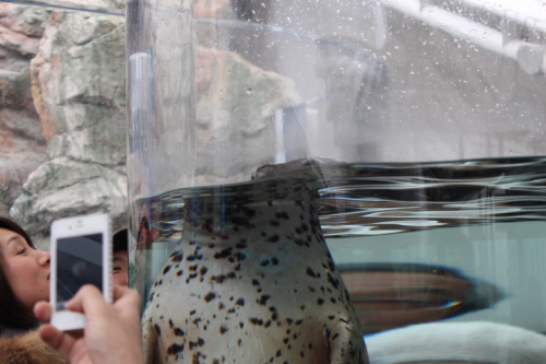 おはようございます。今朝は、2℃でした。いつもに比べたら少しましですね。昨日仕事中に、鏡を見たら左目の内側が充血してました。10月に右目をウィルス性結膜炎をしたばかり・・・。また嫌な予感がしました。看護師に相談し、眼科に行くことに症状は痒くもなく前回とは明らかに違います。目ヤニも出てないし、今回は違うようですね。とどうも、コンタクトレンズ(ソフト)のトラブルだろうとの見解一安心しましたが、しばらくメガネの生活をしないといけません。・・・さて、今日は、13日に行った水族館の続き。アザラシです。夕方でもあって餌の時間。すごく元気に動き回ってました。それを、一番見やすい場所でみていたのが、ひろちゃん。目の前を通過すると。この笑顔。人一倍楽しんでました。本当は、アザラシとひろちゃんのツーショットを撮りたかったのですが動きが早くさすがに撮れませんでした。では、今日はここまでにします。では、今日も一日がんばりましょう。