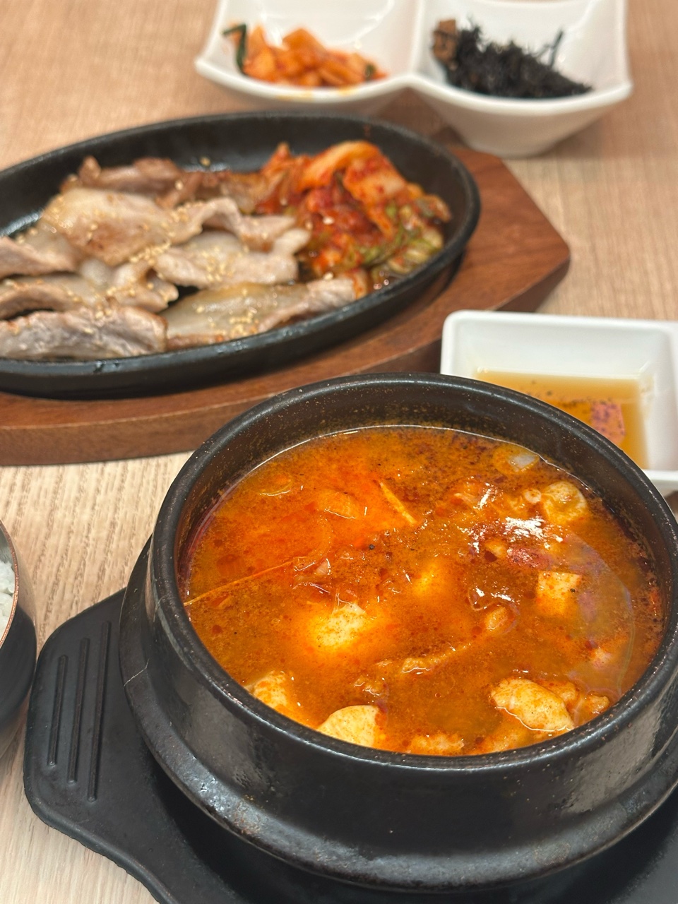 一気に寒くなって…ちょっとばかし風邪っぽいこういうときは熱々フーフーメニュよねと、やってきたのはヤエチカにある韓国料理屋さんいつもは牡蠣バタースンドゥブチゲばかり…ですが、今日は別なもの気分単品のスンドゥブチゲは10種近くあるのだけれどハーフサイズのスンドゥブチゲや石焼ビビンバとのセットメニュがあるんです韓流セットという名前はどうかとも思いますがAセットはビビンバとスープ(スンドゥブチゲあり)Bセットはプルコギやサムギョプサルなど焼き物系とスープ(スンドゥブチゲあり)Cセットは麺とビビンバ、どのセットも小皿2品ランチサラダとドリンクがついて1490円と単品に比べるとめちゃくちゃお得なセットですしかもドリンクはプラス250円でビールもOKそんな訳で?Bの塩サムギョプサルとスンドゥブチゲ、ビールでお願いしましたこの日のおかずはひじきとキムチでしたサラダをアテにビールを飲みながら待ちますハーフサイズとは思えない普通に大きなスンドゥブチゲと鉄板にのせられたサムギョプサルサンチュを追加しても良かったのだけれどたっぷりとキムチが添えられているので野菜はOK状態ですカリっと香ばしく焼かれた豚バラ肉塩とごま油が添えてありましたが単純にキムチを巻いていただくのが正解カリっと香ばしく、ジュワッと甘い脂これはいくらでも行けそう …ビールも進むったらグツグツ&グラグラの真っ赤なチゲはアサリと豚の出汁がたっぷりと溶け出していますなめらかなお豆腐、カリっと食感の良いタケノコ熱々フーフーのスープはさほど辛くはないのですが熱々なものだから口の中がピリピリ残っているキムチも投入し酸味も追加半熟よりちょっとばかし固まりかけのたまごがまろやかさも演出し複雑な味わいのスープいつの間にかうっすらと汗をかくような感覚風邪なんてどこか彼方に吹っ飛んでいく感じご飯を食べる余裕はなかったけれど体中がホカホカと温かくなりすっかり元気を取り戻した気分お肉と豆腐、最強のローカボメニュかもInstagram はこちら(^^♪吾照里 東京駅八重洲地下街店(オジョリ) MAP東京都中央区八重洲2-1 八重洲地下街南1☆★ブログランキングに参加しています★☆一日一回ポチッと応援クリックよろしくお願いしますにほんブログ村こちらもよろしくねメッセージはこちらからお願いします