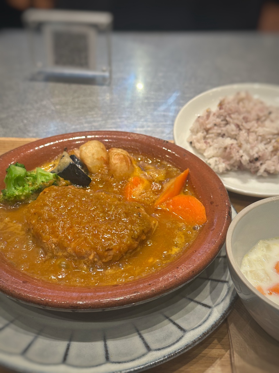 丸の内も皇居側に行くとなると働いている場所からは結構歩くのよねでもこの日はそっち方面に用事があったのでついでに近場でランチをと うろうろ伺ったのは三菱UFJ銀行の入っている永楽ビル地下のレストランはiiyo?っていうのかしら?そこに入っている「スパ飯」なるお店チキンレッグとたっぷり野菜の生姜煮込みかたっぷり野菜のスパイシーカレー煮込み塩麹ハンバーグもデミグラスソース煮か和風みぞれ煮もしくはカレー煮込みの5種ふむふむ、ショウガ煮込みに惹かれるもののチキンレッグは食べにくそうだな …と塩麴ハンバーグとたっぷり野菜のスパイスカレー煮込みにいたします店頭で先払い、季節野菜のスープ(この日は白菜のクラムチャウダーとのこと)ご飯の種類と量(白米か十六穀米)を伝えますお水やカトラリー、スープはセルフなので支払い後にそのままトレーにのせていき指定された席につきます …メイン待ちますスープは野菜がザクザク入るチャウダーですがクリーミーというよりは牛乳っぽいさらさらスープおいしいですがミルク味にしなくてもいいかな?って感じでしょうか…熱々の土鍋でグラグラと湯気を立てながら運ばれてきたメインのハンバーグカレーのスパイシーな香りが好いですね一口いただいてみると …甘っカレー自体はスパイシーなのですが、それもけっこう辛いとは思うのですが塩麴が主張しすぎているというか麹の甘みがかなり舌に残ります野菜たっぷりと謡っていますが、ジャガイモ、にんじんナスとブロッコリが添えられている状態でカレー自体に野菜は玉ねぎの甘みを感じるのみかなハンバーグはしっかり練られた肉肉しいハンバーグでうまみもあり、好印象なのだけれどなにか決め手に欠ける全体にぼやけた印象になってしまうカレー煮込みでしたおいしいのに満足感があまりないのはそのせい?ショウガ煮込みを試してみなきゃ …かしら?Instagram はこちら(^^♪スペメシ Leon MAP東京都千代田区丸の内1-4-1 B1F B118区☆★ブログランキングに参加しています★☆一日一回ポチッと応援クリックよろしくお願いしますにほんブログ村こちらもよろしくねメッセージはこちらからお願いします