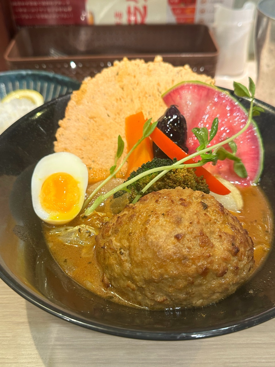 ヤエチカのカレーカルテットに入っている北海道のエビ出汁のスープカレーのお店何度か伺っていますが…野菜のカットが大きくて食べにくいのと …お高めお値段であまり行けないのですでもこの日はどうしてもスープカレーの気分入り口で、エビアレルギー無いですよねと確認されるくらいエビオシのお店またまた若干値上がりしている模様初心にかえって「宗谷黒牛100%おくしばーぐカレー」2200円辛さは中辛~辛口は無料なので、辛口で…ご飯の量は「無し」もあるのだけれど値段が変わるわけではないので(せこ?)小盛りをお願いしますカレーにエビセン、ご飯にレモンは無料ですあっという間に到着するカレーたち奥芝商店の看板商品というおくしバーグは日本最北端の宗谷牧場で育った宗谷黒牛のハンバーグうまみはたっぷりだけれど魚介スープ「元祖」という海老だしスープとも相性が良いのですころんとした丸いフォルムのハンバーグはふわふわでスプーンですんなりほぐせますフォトジェニックなゆで卵(半分)と野菜たちはじゃがいも、ブロッコリー、にんじん、なすパプリカ、紅芯大根、大根、豆苗えびせんがスープに浸ってシナっとなるのでさっさと引き上げ、エビセンとしておいしくいただきますそしてレモンもカレーに絞って、スープをいただくとくぅ~ 野菜の甘みが染みていてハンバーグのうまみが溶け出して… エビの香りが濃厚で そして辛いスープやはりおいしいスープですこの日は野菜のカットは大きいけれど煮込まれていて、案外楽にカットできたので食べやすく(クレームでもないけれど誰かが指摘したのかな?)ふわふわハンバーグ、野菜、スープとバランスよく食べ進むことができてストレスなく最後までおいしくいただくことができました結局ご飯食べる暇?がなく、スープとして完食&完飲冬にはうれしいカレースープ、じゃなかったスープカレーInstagram はこちら(^^♪スープカレー奥芝商店 東京駅浪漫号 MAP 東京都中央区八重洲2-1 八重洲地下街南1 B1F☆★ブログランキングに参加しています★☆一日一回ポチッと応援クリックよろしくお願いしますにほんブログ村こちらもよろしくねメッセージはこちらからお願いします