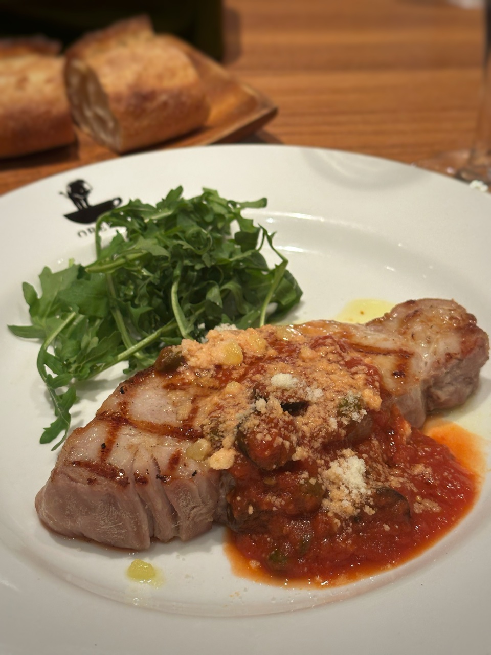 風邪をひいたり、年末年始でバタバタだたりランチの時間が遅くなっちゃったりで社食のように通っていたこちらも随分とご無沙汰ようやく落ち着いて伺えたのは1か月ぶりくらい?せっかくなので泡をいただいておこうこのところビッグサラダ&ハーフパスタのサラダカーニバルばかりだったけれどこの日は「メインランチ」が豚肩ローストマトソースとお肉がっつりいけそうなメニュドレッシングなしでお願いするセットサラダパルミジャーノチーズの塩味で俺の泡がすすんでしまう …おいしあまり待つこともなく大混雑店のランチどきですものオペレーションは気持ちよいほどスムーズしっかりと厚みのある豚ロースは網目の焦げ目が食欲そそる色合いナイフがスッと入るやわらかさ振りかけられたパルミジャーノがトロリととけているのがますます好印象オリーブオイルの香り、チーズの塩味とコク添えられたルッコラの色味がまた好いのよね甘味も酸味も強めのトマトソースにはブラックオリーブも入り良きアクセント脂のほとんどない上質な豚ロース酸味と甘味、塩味のバランスの良いことったらあっさりと、でもしっかりとタンパク質頂戴いたしました~ って思える上質ランチこれで1250円ってやっぱり俺様最高ですInstagram はこちら(^^♪俺のイタリアン 東京駅ヤエチカ MAP東京都中央区八重洲2-1 八重洲地下街 B1F☆★ブログランキングに参加しています★☆一日一回ポチッと応援クリックよろしくお願いしますにほんブログ村こちらもよろしくねメッセージはこちらからお願いします