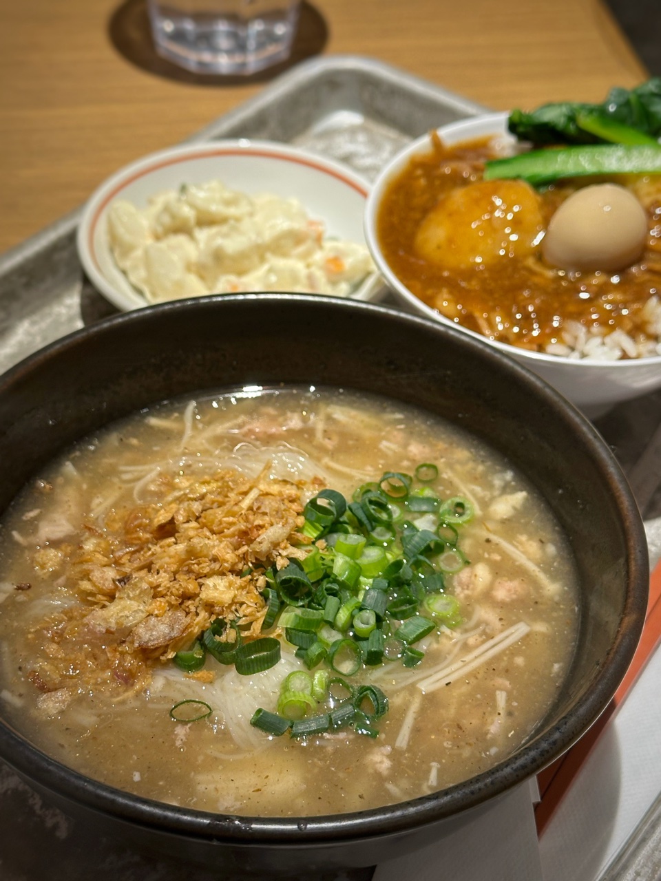 昨今のメニュ改定?改悪??は日常茶飯事ですがあまり変わるとがっかりすることも多いですよね…もちろんその反対もありますが東京駅八重洲北口改札外のグランスタ八重北八重北食堂の多国籍ゾーンにある台湾の屋台風なレストランでもメニュが変わっていました平日15時まではお得なランチセットのみの提供とのこと …それはそうだったかも ですが麺線が食べたかったの麺線を探すと麺線とミニ魯肉飯のセットしか見当たらない…プラス小皿付きで1000円以前は麺線と小鉢とピンクの水餃子っていうセットがあったんですけれどね見るとピンクの水餃子はどのセットにもなくやはり手間がかかるのでしょうかしら?こっそりファンだったので残念しかも麺と飯ってダブル炭水化物それでも麺線がいただきたかったので麺線セットお願いいたしました麺線は台湾独自の細い麺(素麺な感じかな)で出汁はカツオベースでひじょうにやさしい味わい素麺のせいなのかスープにとろみがあって具材のホルモンやエノキ茸や刻み葱と麺が絡みつくとろとろなスープなんともほっこりとする胃にやさしい一皿魯肉飯はミニなのでお茶碗サイズそれでもたっぷり盛り付けられていて餡がこぼれそうだわよ八角のきいた餡に豚の角煮が1切れこれがホロホロになるまで煮込まれていてコラーゲンたっぷりの状態でございますこちらもやさしい味付けなので実は麺線にもルーローハンにも手持ちのガラムマサラ入りの七味唐辛子をたっぷり振りかけちゃったことは …ひ・み・つプチっとうずらたまごがのっているのがたまごラバーとしてはうれしいかぎり小皿は …たくあん?入りのポテサラでしたInstagram はこちら(^^♪日式台湾食堂 WUMEI(ウーメイ) MAP東京都千代田区丸の内1-9-1☆★ブログランキングに参加しています★☆一日一回ポチッと応援クリックよろしくお願いしますにほんブログ村こちらもよろしくねメッセージはこちらからお願いします