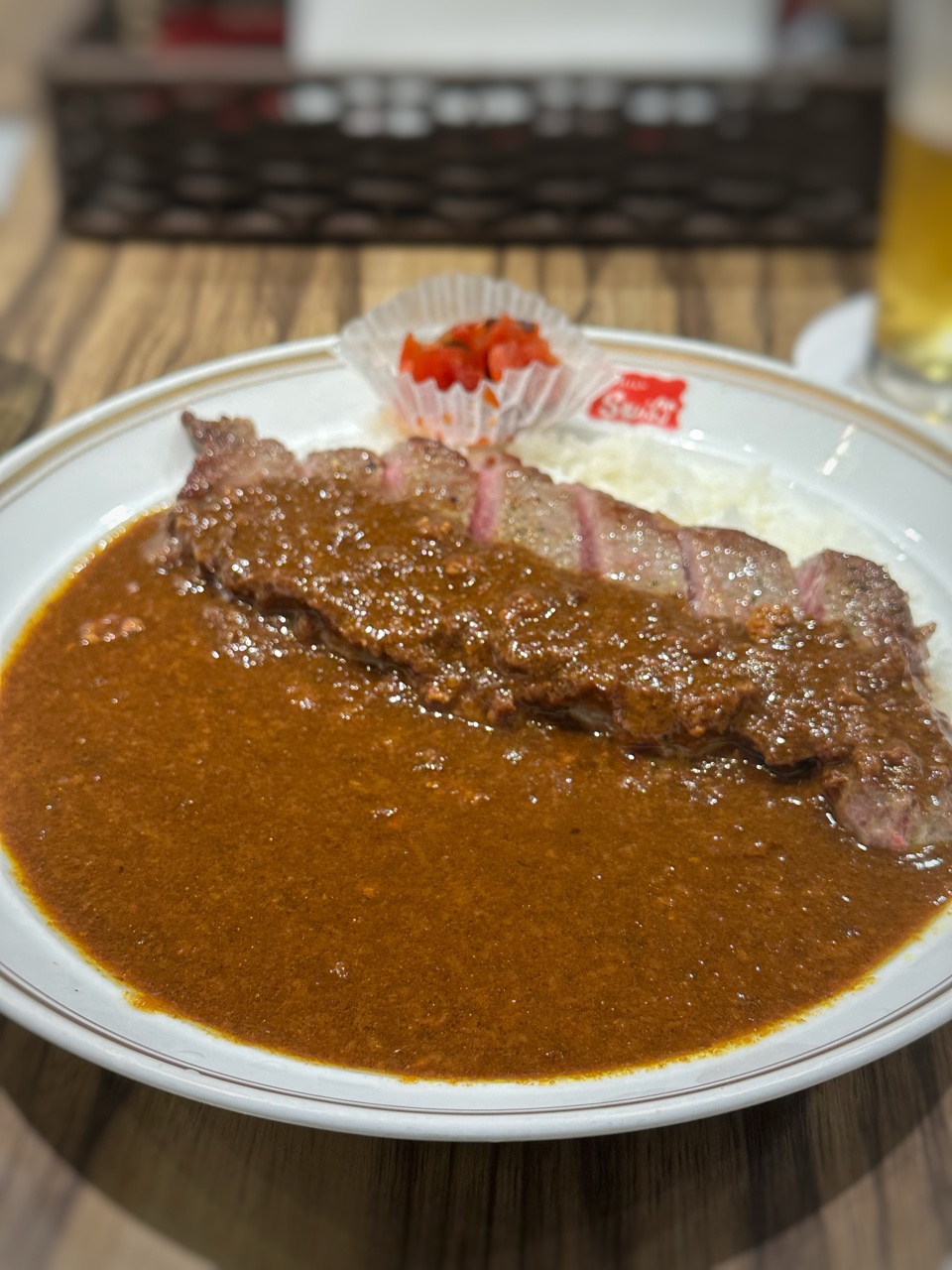 「お節も良いけどカレーもね♪」なんてフレーズを口ずさめる人 同年代です …苦笑お節も食べないのに、カレーは食べたい年始まあカレーはいつでもWelcomeですが…そんな訳で?プチ高級カレーを求めて八重洲地下街のカレーカルテットにある銀座スイスさんでカレーいただきますこの日はなんと大盤振る舞いなステーキカレー(2100円)普段遣いにはとてもとても手が出ないけれどオケージョンランチならね ←どうかな?オケージョンついでに?サラダセット600円まで追加しておいた…サラダとドリンクはアルコールもOK小さいけれど黒ラベルがグラスでついてくるってなんだかオケージョンっぽい?でしょ??サラダもサービスランチのサラダよりは立派洋食屋さんっぽいサラダですステーキカレーはご飯少な目でこの量多いですよ …かなり …色が茶色一色~牛肉のステーキは120gとかなり立派なサイズそして 歯切れのよいやわらかなステーキはナイフで切らずともサクッと噛みきれジューシーな脂と赤身の良いバランスカレー自体は欧州カレーなので甘めというかスパイシーだけれどマイルドなのでおお肉の味が消えずステーキとしても美味カツカレー発祥のお店ではあるけれどここはカツよりステーキの方が合う気がしますちょっと毛色は違うけれど銀座の「楸」のステーキカレーを思い出すようなお味でしたInstagram はこちら(^^♪銀座スイス ヤエチカ店 MAP東京都中央区八重洲2-1 八重洲地下街☆★ブログランキングに参加しています★☆一日一回ポチッと応援クリックよろしくお願いしますにほんブログ村こちらもよろしくねメッセージはこちらからお願いします