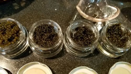 さいたま市のスナック 『ペーパームーン』本日はなんと キャビアの食べ比べ! キャビアなんて、めったにお目にかかれない。 それを製作者が食べくらべの体験をさせて下さいました。 この4種 2種類のチョウザメの卵を産地の違う塩で漬けたもの。 わかりやすいくらい、味が違いましたよ。