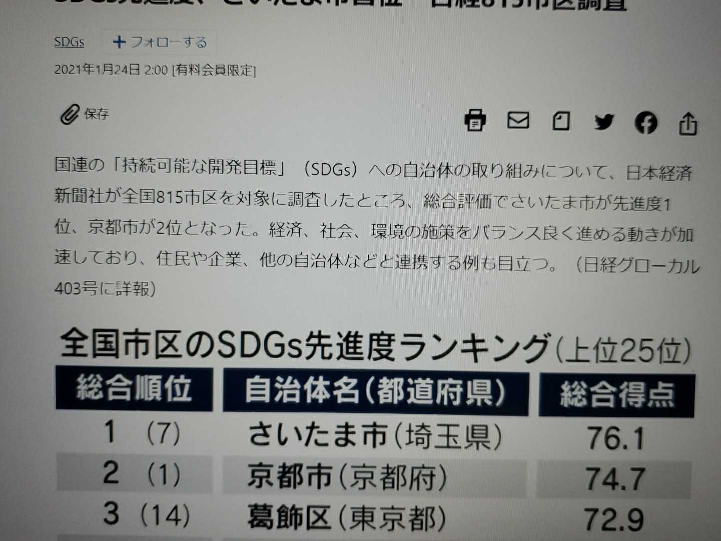 埼玉県さいたま市のペーパームーンです。 本日は日曜日、雪の予報があったものの 冷たい雨がしとしと。 とーぜん外気は超ひえひえでしょう。 日経電子版でみつけた ランキングでさいたま市が1位ですよ。 これは驚きましたわぁ。 そもそもSDGs とは 持続可能な開発目標の略称。 17の大きな目標と、それらを達成するための具体的な169のターゲットで構成されています。 貧困をなくそう、飢餓をゼロに、すべての人に健康と福祉を………とか。 さいたま市は美園地区の開発をすすめているそうですね。 スマートシティというコンセプト、大宮の街の開発はまだまだ先だろぅなー(笑)