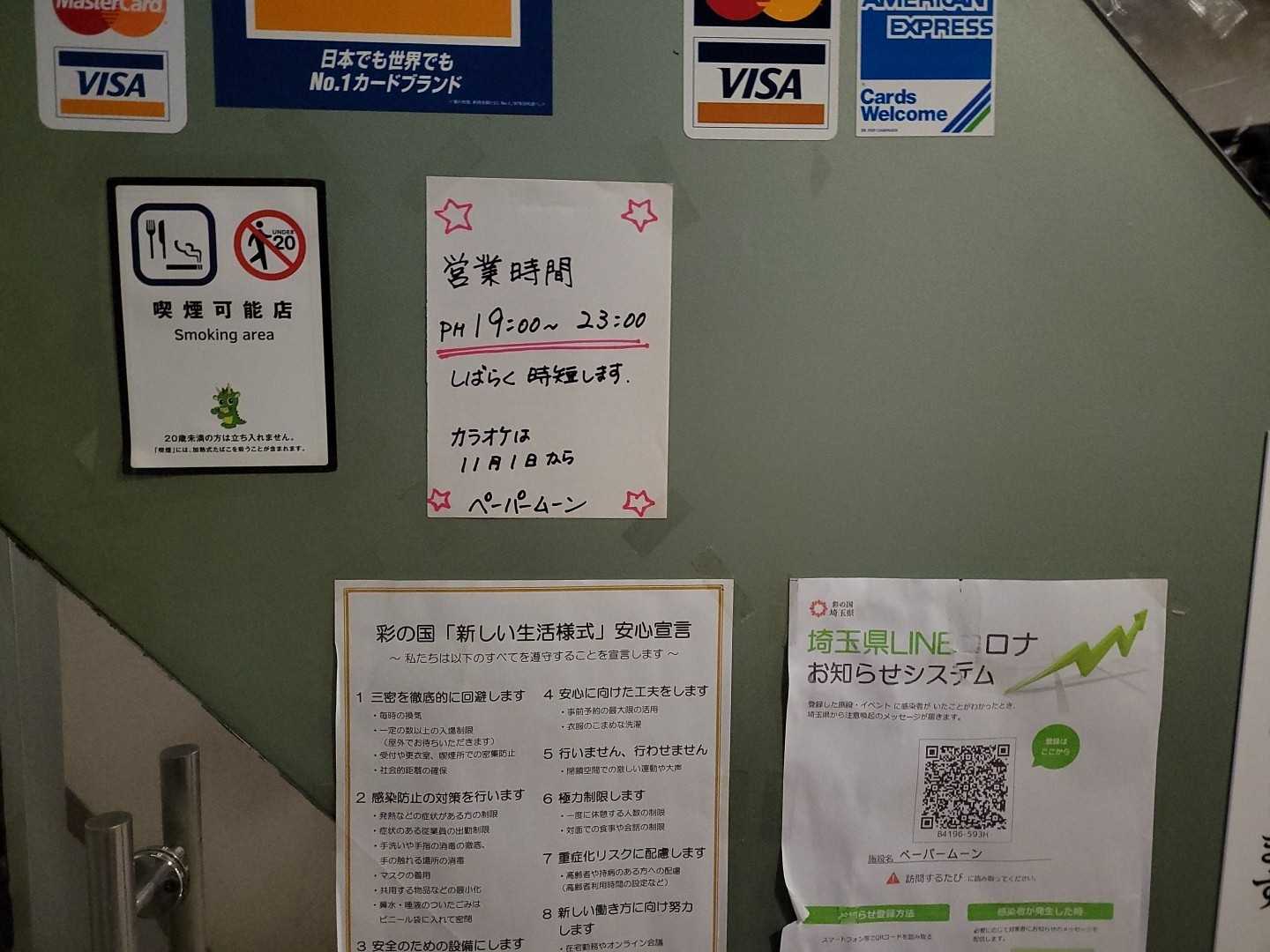 ペーパームーン 10月25日から営業時間はPM19時~23時 しばらくは時短営業とさせて頂きます。 カラオケ再開は11月1日からです。