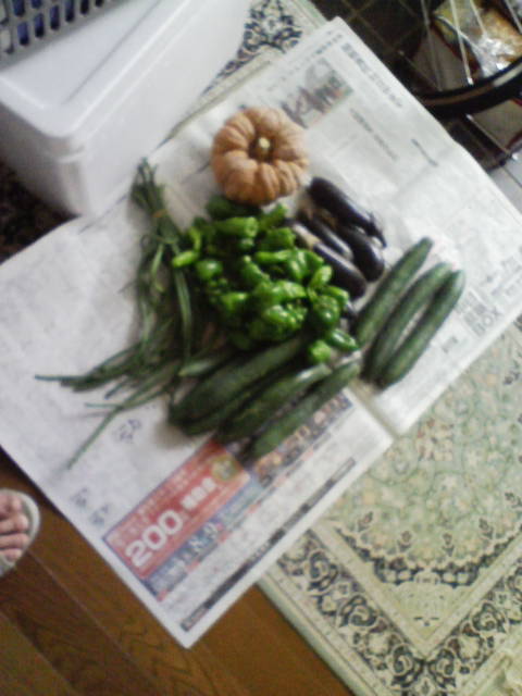早朝(6:40)の電話。近所の方から、野菜を今から届けます。ということで、電話で起こされる。少し、ピンボケです。これが届いた野菜。冬瓜も2個ありました。そして、樫の木の枝を伐りました。これもピンボケ。約一時間半、はしごに登り新しく伸びた芽を中心に落としました。汗、びっしょり、まるでバケツで水を頭からかぶった様。